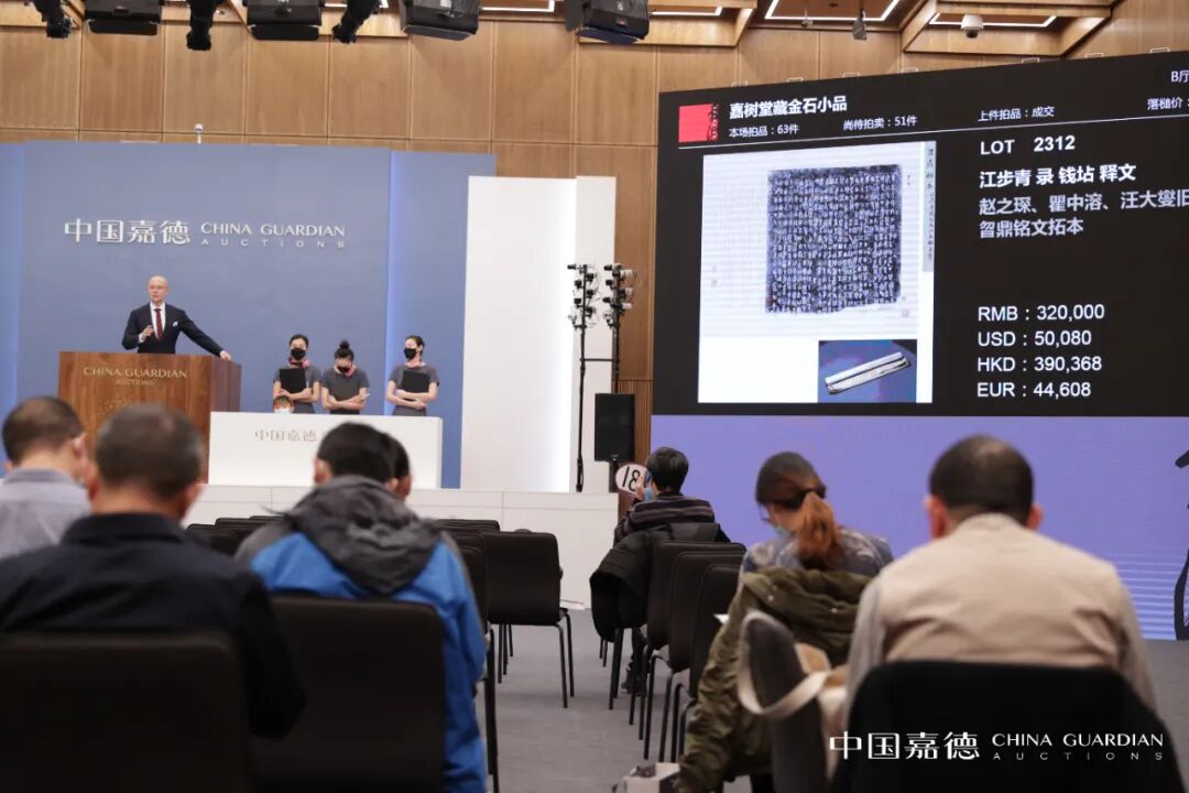 “嘉树堂藏金石小品”专场荟萃沪上著名收藏家——嘉树堂主人陈郁先生十余年来搜集的各类金石杂拓63件,从西周青铜重器,到兵戈玺印、镜鉴兵符、先秦泉范、权量诏版、汉魏古砖、南朝石刻、五代造像、宋元钞版,内容涉及历史、地理、考古、军事、经济、艺术,信息极为丰富。清晰地反映了从清中期开始金石学发展的新面貌,深得金石藏家认可。拍场人气旺盛,竞拍积极踊跃,全场拍品悉数成交,喜获白手套。总成交为736.92万元。