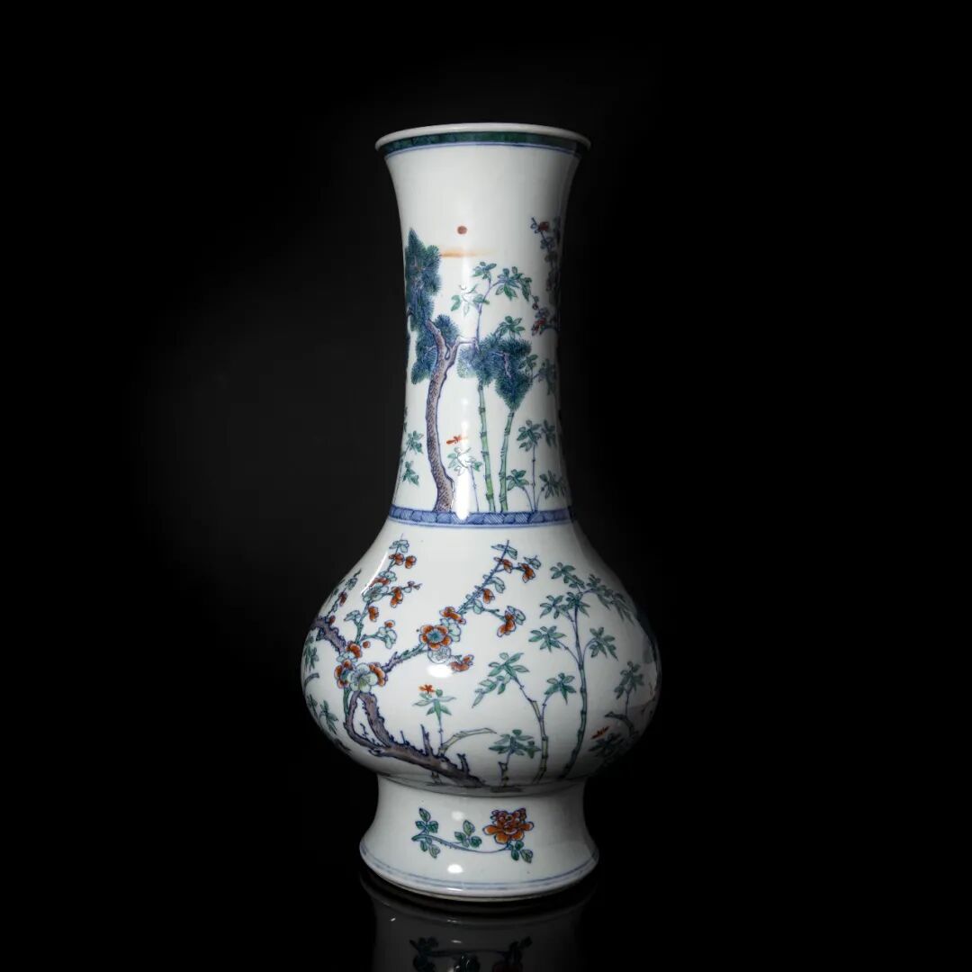 本期重点拍品即为一例:清康熙 斗彩松竹梅长颈瓶,邀大家共赏。
