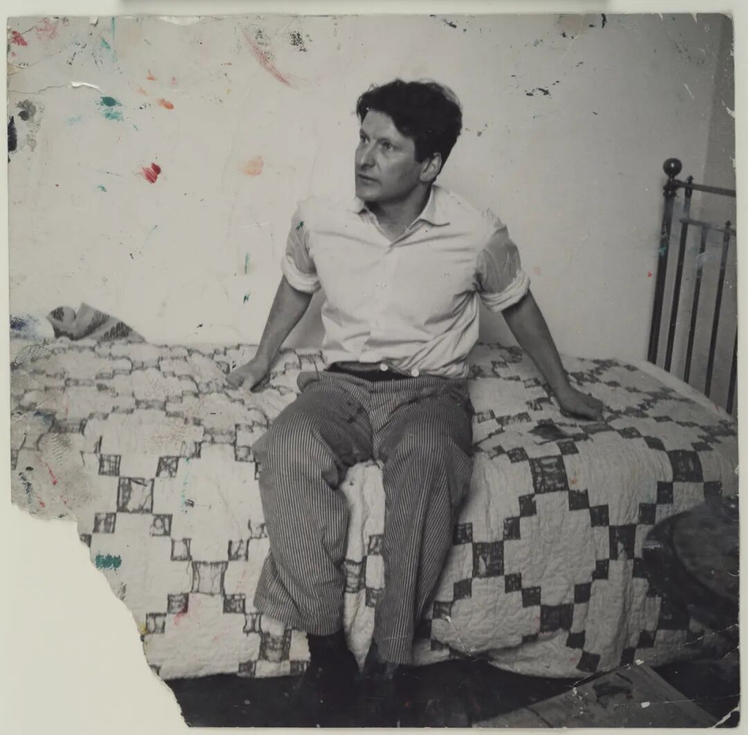 由John Deakin 所摄,卢西安弗洛伊德坐在床上的照片