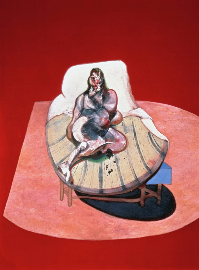 全都依据(两人的朋友约翰)迪肯所拍摄的弗洛伊德照片,而那些照片的制作其实经过深思熟虑,有计划地铺排出戏剧色彩。培根会强调形体的知觉,善于放大坐下、弓身或活动身体放松脖子和膝窝的感受。他喜欢在瞬间猛然流露出来的感受,而这通常牵涉到姿势的转换。