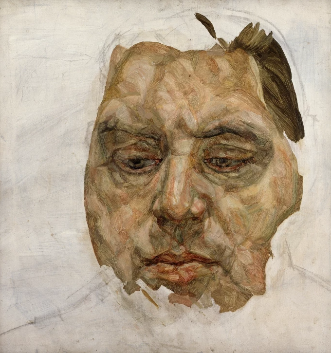 在《卢西安弗洛伊德肖像习作》中,狂乱的翠绿、粉红和白色笔触在弗洛伊德的脸上搅成一团,呈现出一种发自本能的动态——或猛然的抽动——弗洛伊德的头正快速地拧向一边,上半身以紧绷进逼的姿态向前倾。