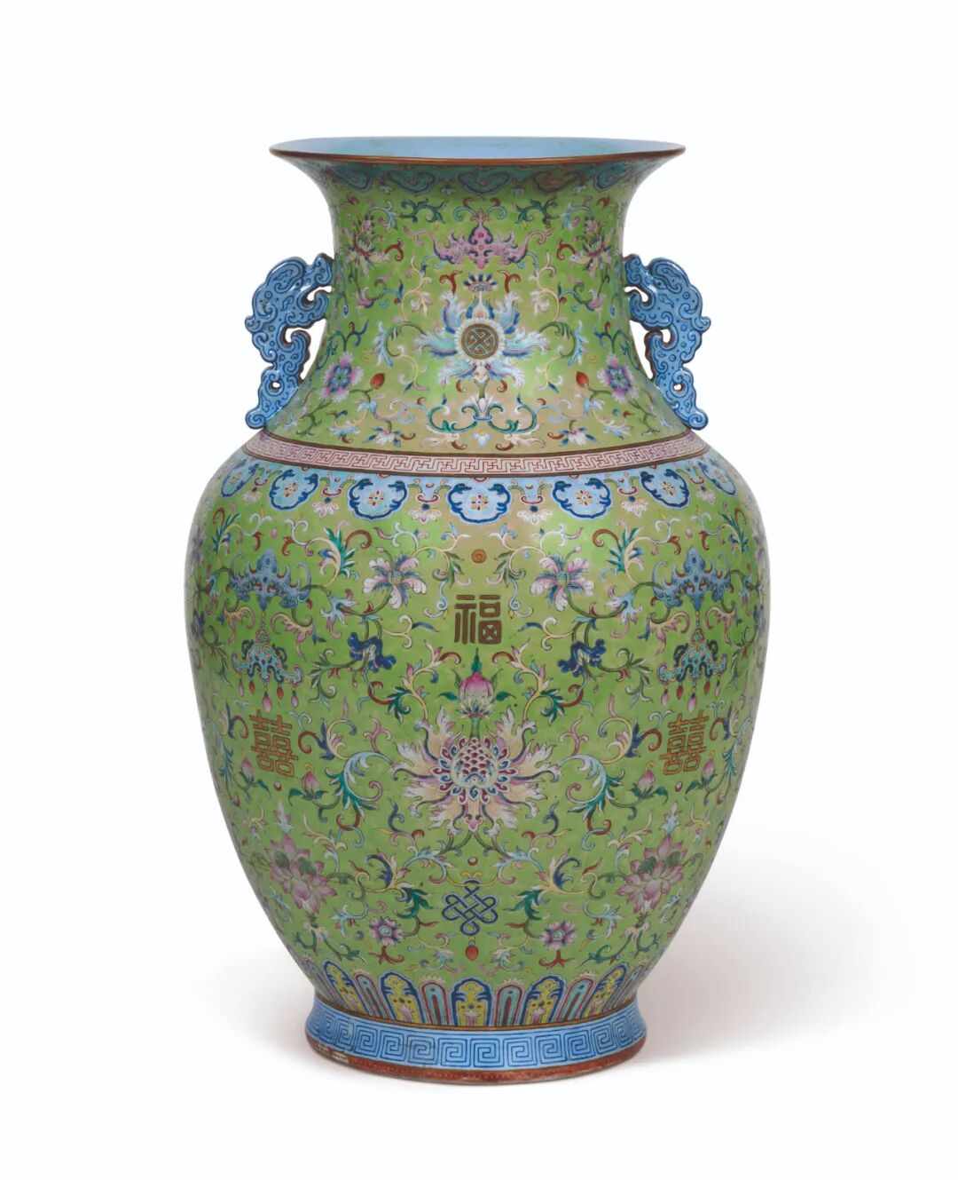 绿地粉彩喜字缠枝莲纹双耳大瓶