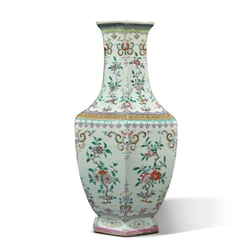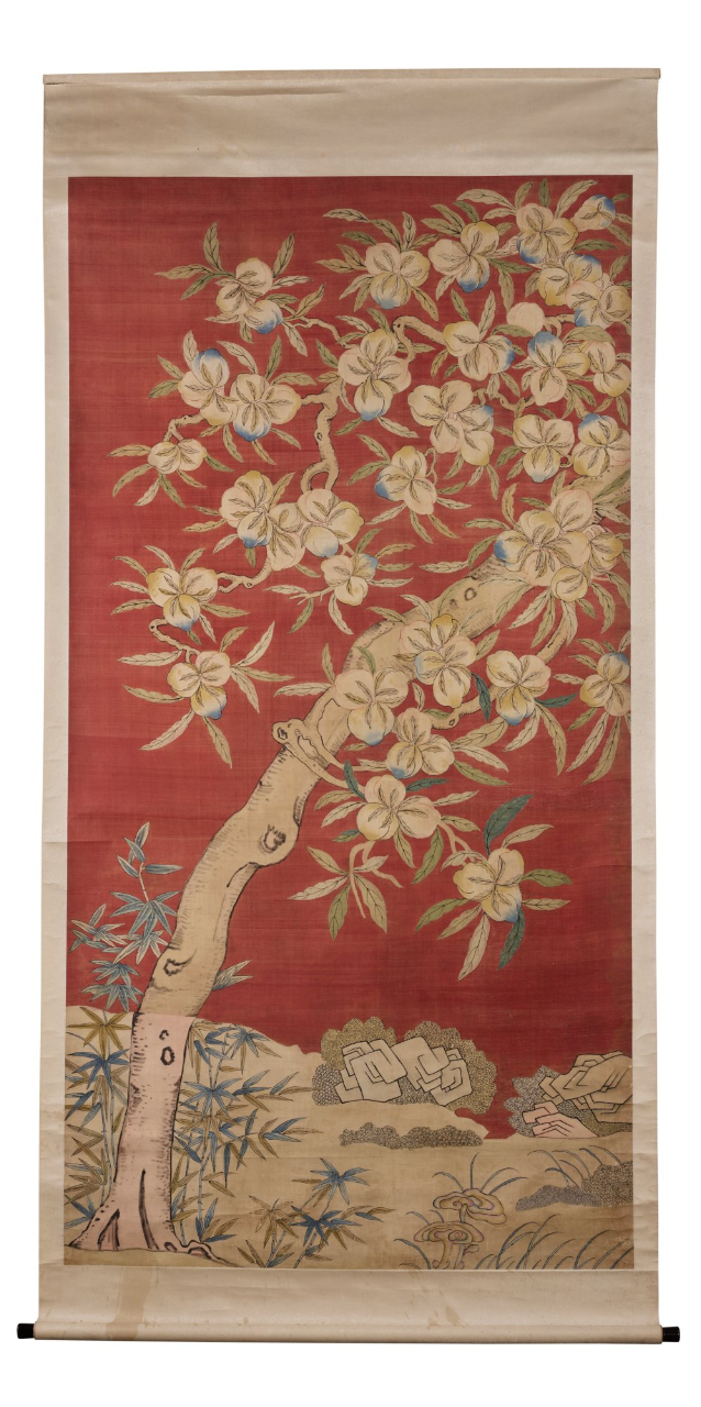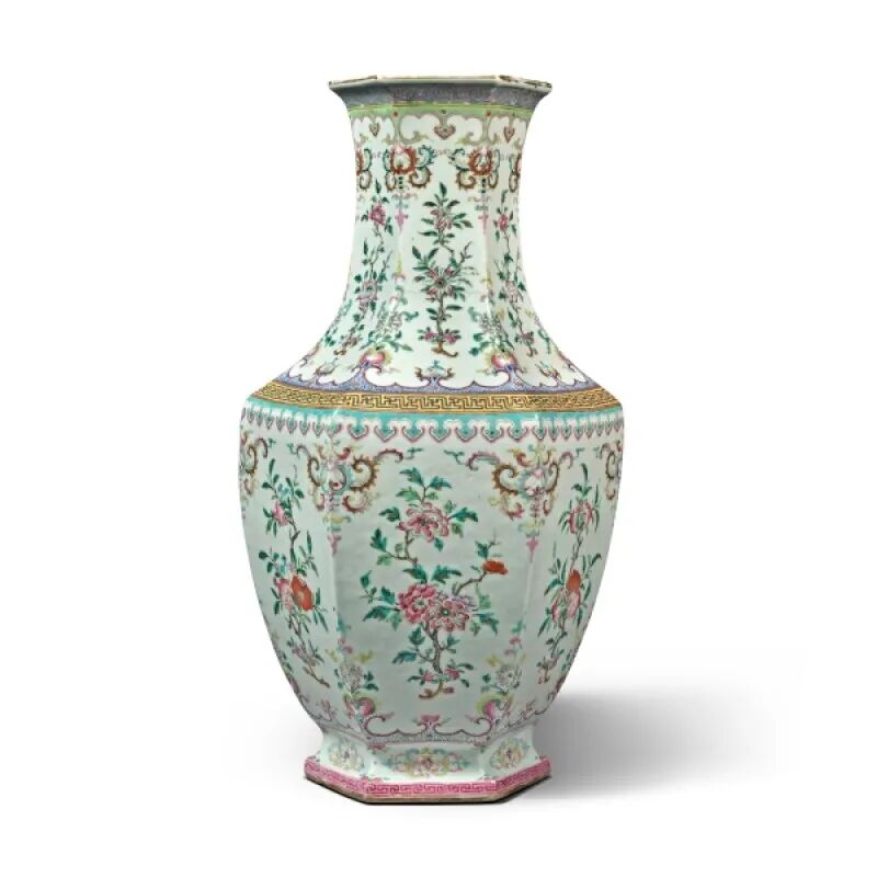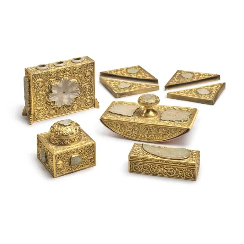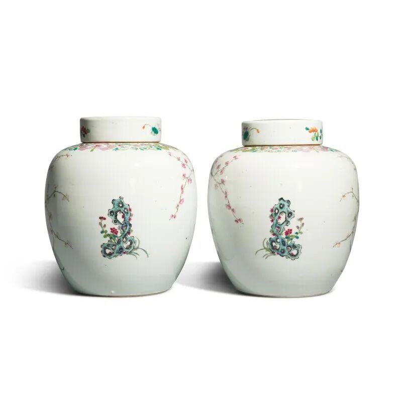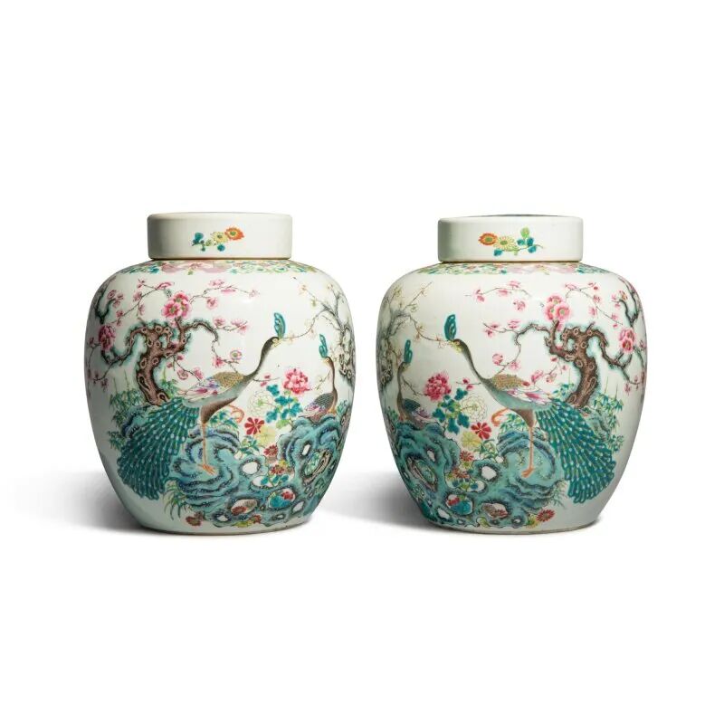 Lot 71 十九 / 二十世纪 缂丝寿桃图大褂屏Lot 59 二十世纪 金属鎏金卷草吉祥纹案套装文具八件来源:纽约苏富比,2013年9月17日至18日,编号 154。Lot 83 十九世纪 / 二十世纪初 粉彩花果纹六方大瓶1.伦敦佳士得,1979年11月26日,编号337Lot 121 清十九世纪 粉彩孔雀花卉纹盖罐一对