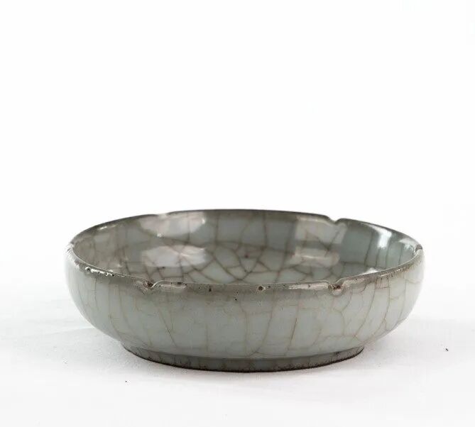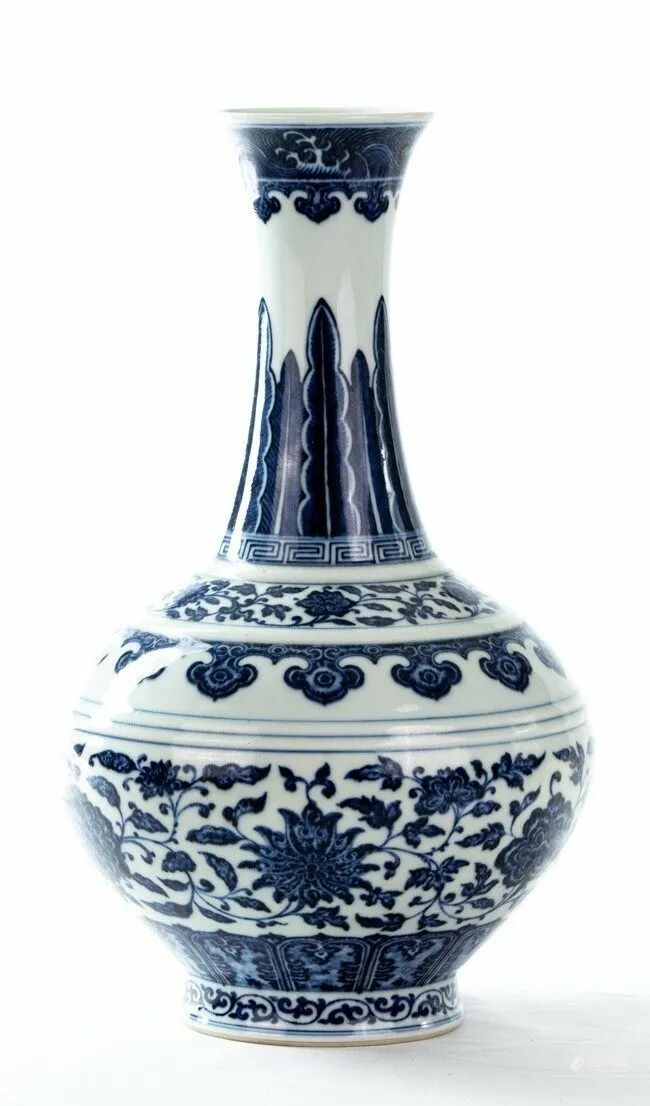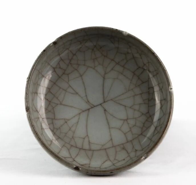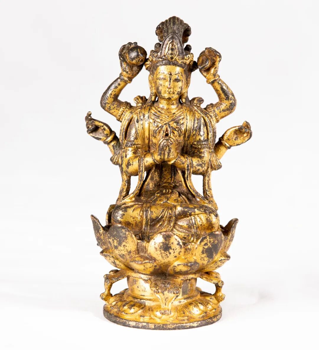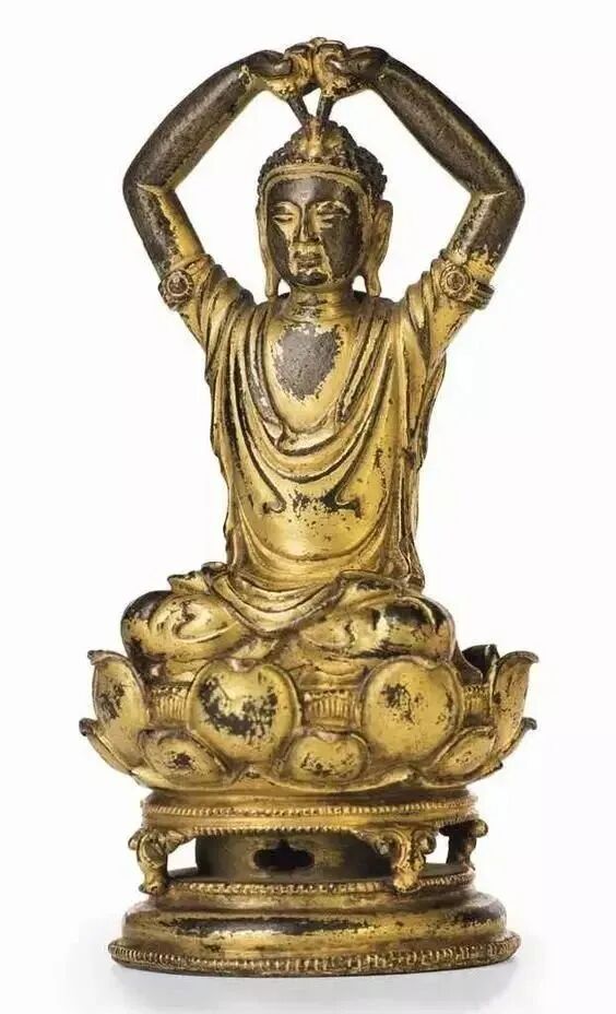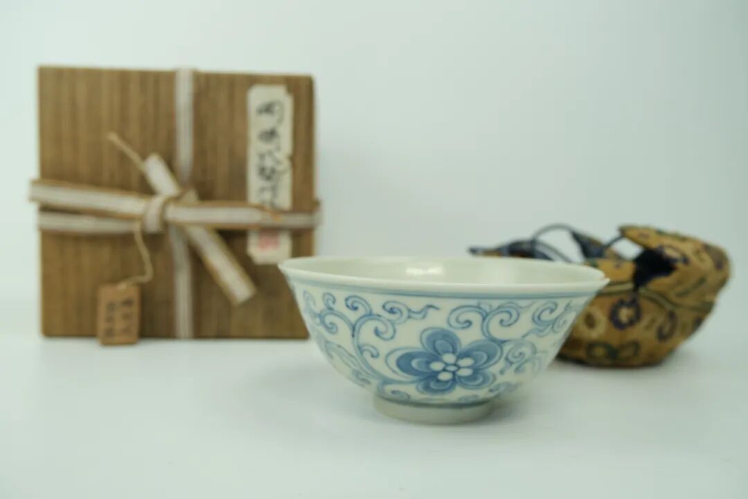 本件来自島津法樹旧藏的观音像是不可多得的艺术珍品,佛像整体体现了辽代高水平的佛像制作工艺。观音坐于二层外展式仰莲台上,下承圆座,底部亦有连瓣纹装饰。头戴环状宝冠,面相圆润安详,眉眼修长,双目微张,鼻挺唇薄,眉心装饰白毫。该观音造像六臂左右对称分布,上部两臂手持宝物(宝珠法螺),中间与胸前两臂各做佛印。胸部宽浑,腰部却纤长。上身佩戴璎珞,披帛挂肩垂落。衣纹线条流畅,极具自然质感。整体造型沉静,于宁谧中尽展宝相庄严。其莲座亦值得关注,此莲座莲瓣饱满,莲尖微微向外翻出,栩栩如生。特别是除了中央支柱外,莲座与底盘之间还有四支雕有纹饰的支架连接,此类造型十分罕见。2017年巴黎佳士得辽大日如来创造了8400万的成绩,另外相似造像藏品可参见荷兰阿姆斯特丹国立博物馆藏的辽代观音(图1),以及2014年3月佳士得纽约般若妙相专场Lot 3484号拍品(图2)。此藏品为島津法樹旧藏明成化款青花碗。碗底有「大明成化年制」款。疑似初烧之后因有窑裂,未填彩而被遗弃。器物本身有土浸痕迹,碗口处有窑裂,疑为出土。
