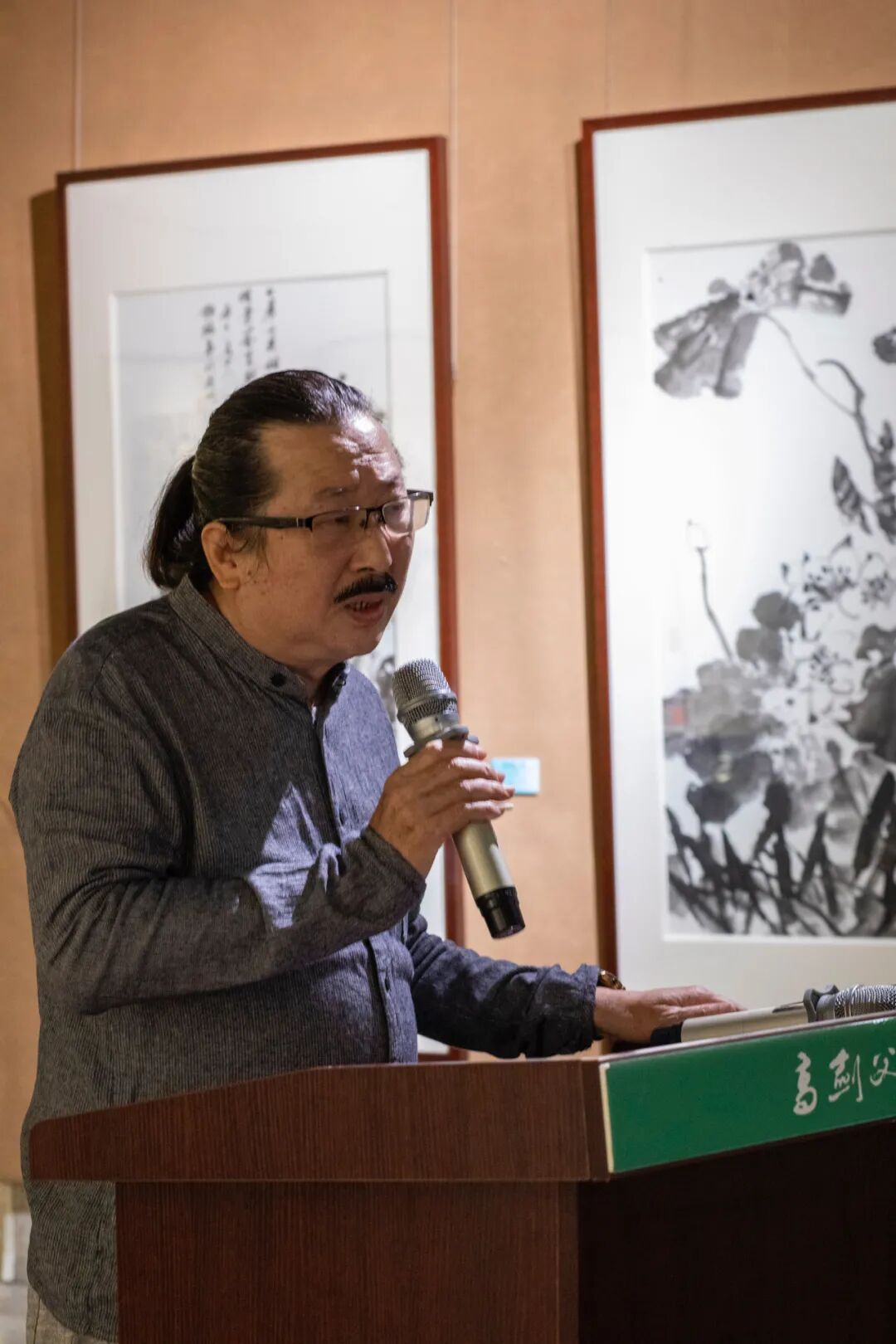 本次展览总倡导人、广东省委宣传部原副部长刘斯奋先生参加了开幕式并致辞:“回望魏晋,以‘竹林七贤’及曹植、陶渊明为代表的魏晋士人,或韬光养晦,或离俗出世,往往把臂归隐,把酒谈玄,率意人生,造就魏晋风度。而‘把臂同行’亦成为秉志同行的代名词。行至民国,更有岭南剑父先生秉承艺术救国之宗旨,创办春睡画院,不计贫富,唯计品德,课画授徒,长幼同行,何尝不又是另一种把臂入林?可以说,以天下为己任的家国情怀,超越个人情感的士子精神,以及秉志同行的气度,是中华民族优秀知识分子的固有传统。刘斯奋说道,我们此次展览是让大家在自由自在的状态下,不受创作题材的限制,尽情发挥艺术个性,追求个人目标,在学术上有所追求,现在是第五届,我们还将一届一届办下去。”