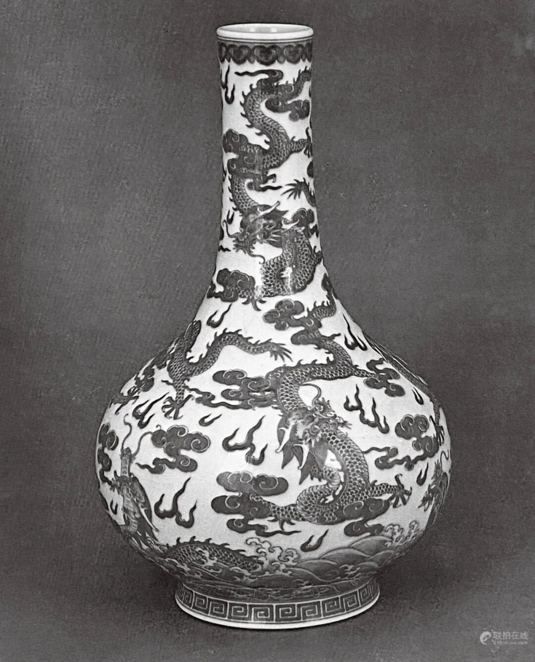 拍品估价:400,000 - 600,000 人民币拍品直口,长颈,溜肩,直腹,圈足。造型高雅,线条柔美,其外壁通绘青花祥云九龙纹,九条威龙穿梭于祥云、火珠之间,神态生动,气势磅礴,显得威严庄重。九龙又暗合《易经》中『九五,飞龙在天,利见大人』之『九五之尊』之寓,颇显皇家威仪。『龙,鳞虫之长,能幽能明,能细能巨,能长能短。春分而登天,秋分而潜渊……』龙纹不仅是祥瑞的象征,更是作为明清两朝皇家御用的帝王专属之纹,满清帝王致力于塑造其正统性与无上皇权,在各类宫廷御用的艺术品上广泛使用龙纹,特别是作为宫廷陈设和使用的御窑瓷器中,有如本器。瓶身以青花满绘祥云九龙纹,海水波涛汹涌,九龙形态各异,或正面威严,或腾空而起,或水中翻滚,气度非凡,于一瓶之祥云间腾跃的巨龙描绘得极为威武生动,体现了飞龙在天的皇家威仪,皇家气派十足。特别是本品尺寸适中,非大型陈设器,也非十余厘米的小瓶,而是近三十厘米,大小适中,是可以在皇帝万机之暇把玩品鉴之物。整器布局疏密有致,繁而不乱,纹饰层次丰富,青花发色妍丽,釉色纯净幽雅,纹饰线条遒劲流畅,当为嘉庆宫廷陈设精品,可堪珍藏。