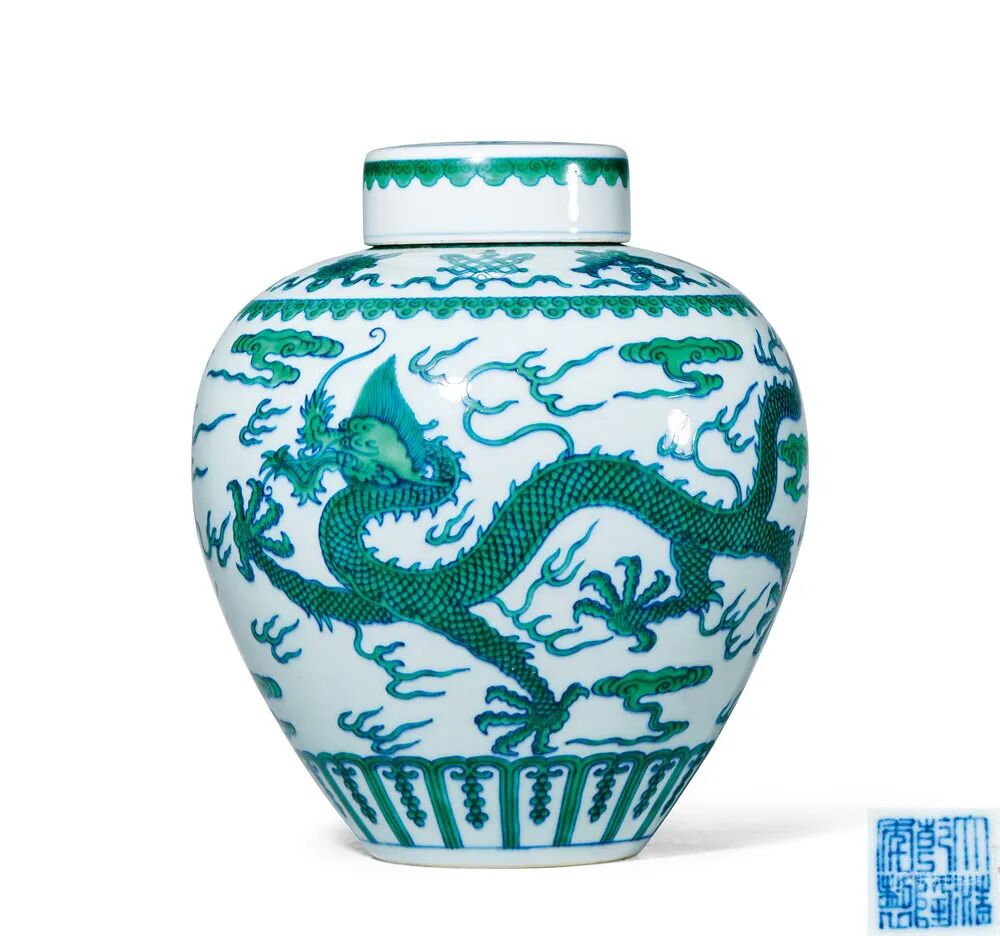拍品估价:800,000 - 1,200,000 人民币记录:天津文物,2013年11月22日,编号405出版:《中国民间收藏陶瓷大系·北京 天津卷》,河北美术出版社,2019年,页2391.《故宫博物院藏文物珍品大系-五彩斗彩》,故宫博物院,页208,图1902.《宫廷珍藏—中国清代官窑瓷器》,南京博物院,2003 年,页271此式绿彩八吉祥赶珠云龙纹罐为清代官窑经典品种,据《清宫瓷器档案全集》记载:『彩绿龙八宝盖罐为大运瓷器品种之一,自雍正朝始造,直到道光朝均有烧造,以后不再烧造。』此罐带盖,直口、丰肩、鼓腹下收,器形端正。胎体洁白坚致,釉面滋润亮泽。通体以青花绘纹饰线条,复填绿彩。口沿处有一道弦纹,肩部绘八宝结带,下有一周如意云头纹将之与腹部主题纹饰云龙间隔开来。腹部绘双龙戏珠纹,龙纹形状威猛,龙身伸展飞腾,张口吐舌,龙爪刚劲有力,飞腾于云朵之间,追逐宝珠。周围饰以火焰,威武雄壮,极富感染力。近底处作一周变形莲瓣纹。纹饰填彩精准,绿彩娇嫩明艳,为乾隆官窑的精品。