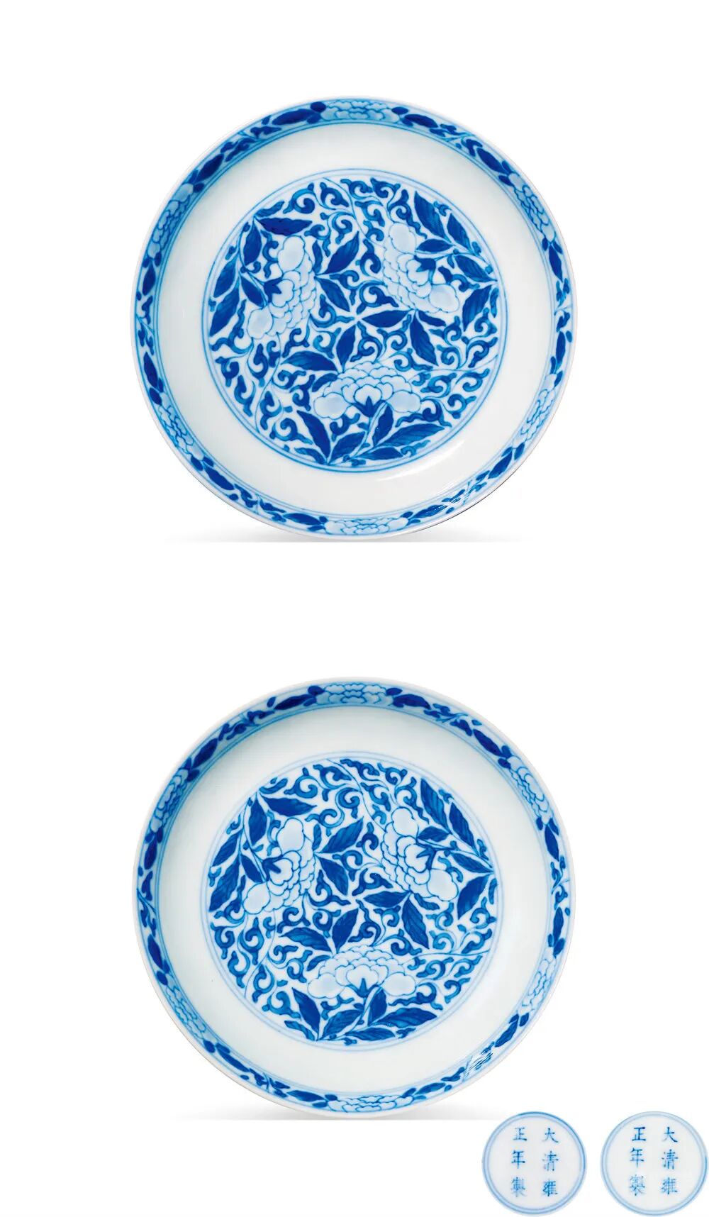 拍品估价:350,000 - 450,000 人民币记录:中国嘉德,2000年11月06日,编号1161此对拍品撇口,浅弧腹,圈足。形制小巧隽秀,通体以青花为饰,盘心、外壁遍绘缠枝花卉纹,花朵娇妍,枝蔓卷曲。纹饰繁而不乱,笔触工饬流畅,青花发色雅致。此对拍品胎质精细,釉面光滑莹润,极具玻璃质感。成对传世,较为少见。青花瓷是明清时期生产的重要瓷器品种之一,由于各时期使用钴料的不同,艺术风格不同,各领风骚。雍正一朝虽仅13年,但其官窑青花瓷器烧造达到了炉火纯青的地步。雍正青花瓷可与享有盛誉的『永宣青花』媲美,其在康熙朝制瓷技艺基础上继承和发展。其造型一改康熙时期浑厚古拙之风,崇尚轻巧俊秀工丽之貌,其绘制也由康熙时期的雄浑苍劲,而代之以隽秀尔雅的艺术风韵。拍品即为雍正时期青花瓷的代表作,正如陈浏撰《陶雅》赞有『雍正官窑大小盘,碗白胜霜雪,既轻且坚』。