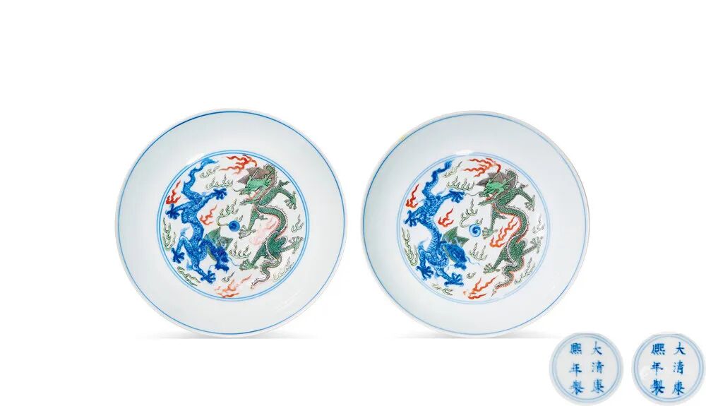 拍品估价:600,000 - 800,000 人民币参阅:《孙瀛洲的陶瓷世界》,紫禁城出版社,页121,图61盘为敞口,弧壁,浅腹,圈足。内外壁均施白釉,釉面莹润光亮。外壁釉下刻划海水纹,釉上以绿彩描绘两条五爪云龙,祥龙身躯蜿蜒,极富动感;内底、口沿及足墙处均绘饰绿彩弦线,盘心施绿彩绘一侧面团龙,龙纹轮廓清晰,周饰祥云。外底青花双圈内书「大明正德年製」六字双行楷书款,字体规整雅致。整器胎体细腻,釉质润泽,线条勾画自然流畅,纹饰生动传神,颇具帝王之气。白釉绿彩瓷始烧造于明宣德年间,兴盛于成化、弘治、正德三朝,造型多为盘、碗。其烧造工艺较为繁复,需先于素胎上刻绘纹样,然后将纹样外的地子施以透明釉,待入窑高温烧成后,再填以绿彩,二次入窑低温烧造而成。而此类云龙纹盘始自成化,正德最兴,嘉靖之后则不复见矣。据载,当时为迎合皇帝喜好,御窑厂在此时精工细刻烧造了一批此样式龙盘,尺寸由十五公分至二十三公分不等,绘画施彩均达当时最高水平。