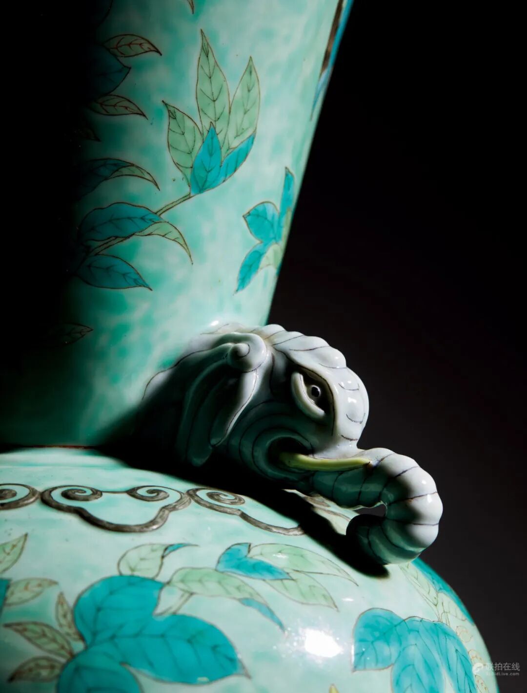 Lot 845 清光绪 松石绿地粉彩富贵报喜图象耳瓶拍品估价:600,000 - 800,000 人民币1.《官样御瓷:故宫博物院藏清代製瓷官样与御窑瓷器》,紫禁城出版社,2007年,页196、1972.《御堂佳器:晚清宫廷帝后用瓷》,故宫出版社,2022年,页64、65拍品与北京故宫博物院藏品品种相同,为光绪时期慈禧太后的专用瓷器,极富时代特色。拍品撇口,腹部圆鼓,圈足外撇。胎体厚重,肩部两侧象耳生动逼真。肩部隐起如意头纹一周,并墨彩勾边。外壁以松石绿地粉彩为饰,颈部和腹部绘牡丹盛开,喜鹊飞翔其间,通体纹饰布局满密,花繁枝茂,一片富贵繁荣的好景象。北京故宫博物院收藏有此品种之画样,其黄题签书:『照此样,翡翠地花瓶二对,一尺五高二对,六寸至三寸各四对』。