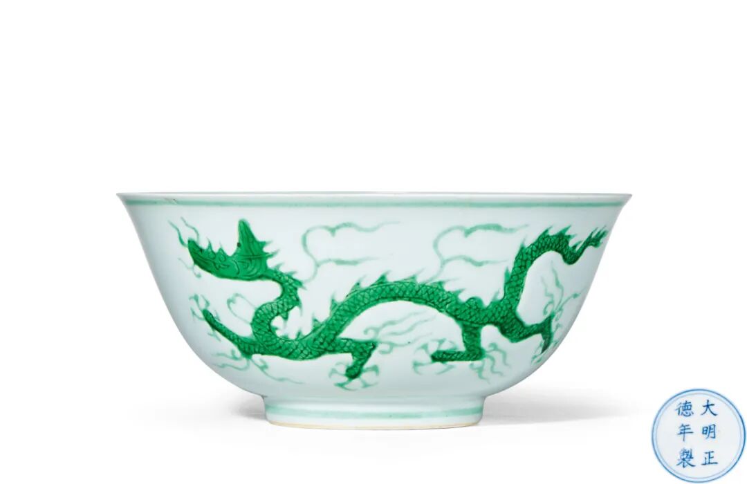 拍品估价:250,000 - 350,000 人民币来源:美国收藏家安·斯坦威德尔·唐纳利·哈迪(1907年-2001年)旧藏1. G. Valenstein,《A Handbook of Chinese Ceramics》,纽约,1989年,图版156;2. Daisy Lion-Goldschmidt,《Ming Porcelain》,弗里堡,1978年,图版106;3. 康蕊君,《玫茵堂中国陶瓷》,伦敦,1994-2010年,卷2,编号695,后售于香港苏富比,2012年10月9日,编号20。此碗造型规整,口沿微敞,胎质细腻,通体施釉,碗内外及圈足内均施白釉。内底及外壁均以暗花海水绿彩云龙纹装饰。碗心绘一条游龙,龙盘旋矫健,苍劲有力;外壁饰有两条行龙,龙首前伸,身躯弓起,尾部有弧度地扬起。龙都是五爪,似风车状。龙纹线条纤细,舒展自然。碗底心青花书「大明正德年製」六字双行楷书款。白釉绿彩瓷器始烧于明代永乐时期,成化、弘治、正德、嘉靖、万历时期均有烧造。明宣德官窑的白釉绿彩,是明代的稀有珍品。成化时期白釉绿彩已趋成熟,绿彩色泽浅淡,微闪黄色,透明感强。明代正德年间的官窑瓷器多产于景德镇。《江西大志·陶政》记载:『正德初,设御器厂,专营御器。』