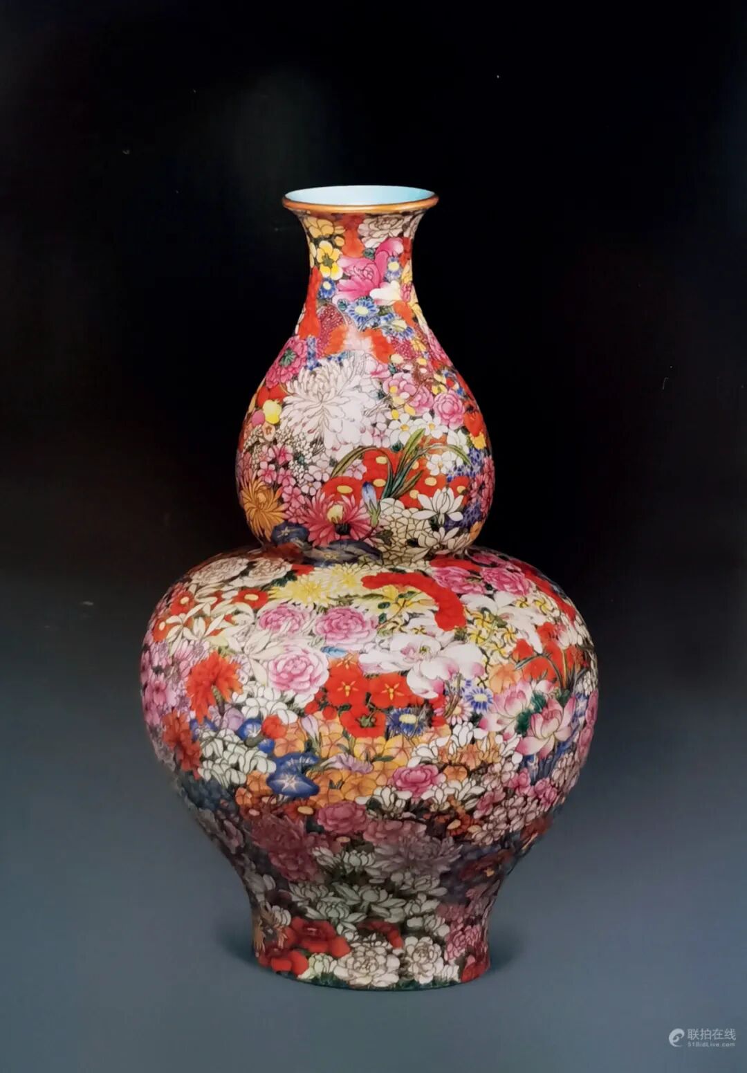 拍品估价:300,000 - 500,000 人民币记录:香港佳士得,2002年4月29日,编号569参阅:《中国国家博物馆馆藏文物研究丛书—瓷器卷·清代》,上海古籍出版社,2007年,页159,图104拍品器型饱满,造型秀丽,线条流畅。器内及足内施松石绿釉,质地匀润,外壁以粉彩百花不落地为饰,此类纹样表现为花朵相互簇拥、不留空隙之布局,于有限的空间内堆迭的绘饰月季、牡丹、菊花、忘忧、兰花、牵牛花、大波斯菊、秋海棠、矢车菊、梅花、荷花、荷叶、虞美人等各式花卉,又称『万花锦』,『万花献瑞』,『万花献寿』,以繁盛鲜妍,目不暇接的繁花纹样取胜。此类纹样,花团锦簇,多彩并施,要求绘功落笔准确,毫厘不差,方可成器。此类纹样初见于康熙时期铜胎画珐琅,参考北京故宫博物院藏水丞,录于《故宫博物院藏品大系·珐琅器编·卷5》,图版32。于御瓷上作为装饰纹样则始见于雍正朝,此后延烧,但仍以乾隆和嘉庆时期万花献瑞纹样最为繁密考究。据清宫档案记载,百花不露地者,是帝王专用赏花应景之瓷,所以较清其它官窑相比,工艺更为讲究。首先,需要内务府造办处出具画样,设计出百花齐聚之画稿,上呈皇帝审批后,再交付御窑厂作为粉本,其构思最妙之处则是尽收春意盎然之象而又无砌堆之感,殊为巧思。其次,御窑厂的工匠依照工样将画稿临摹勾勒于白瓷胎上,务必毫厘不差,同时又要照顾到器表不同于纸面的不均衡特性,稍有差池,便会前功尽弃,极其考验工匠的制瓷技巧。再者,百花不露地者,一器之上所见颜色不下三十余种,彩料配制之多堪称众瓷之首,故绘画之前,彩瓷的所有颜料必须配备,种类繁多几近百种,均需一一调试,此项工作工程之浩大可想而知。最后,填绘洗染,必经画师数人之手,历十数日之功方可入窑。故一器告成,历时数月之久,耗资甚巨,绝非其它御瓷可比。如此繁复之至,必将注定百花不露地者烧造不多,其珍贵难得程度可见一斑。国家博物馆藏有一乾隆粉彩百花不露地葫芦瓶,装饰工艺与拍品相同,可兹参照。