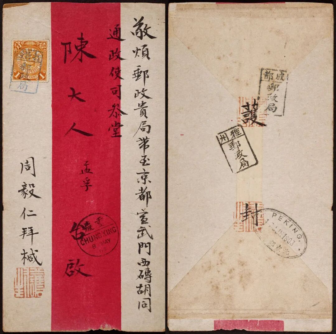 1903年打箭炉寄北京红条封,正贴蟠龙1分一枚,盖“打箭炉邮政局”碑型二格蓝绿色戳,另盖重庆5月8日汉英半切小圆戳中转,背分盖“雅州邮政局”及“成都邮政局”碑型戳中转各一枚,落地北京邮政局1903年6月17日双圈英汉椭圆日戳到达,此封寄京都通政使司陈孟孚大人,封品上佳