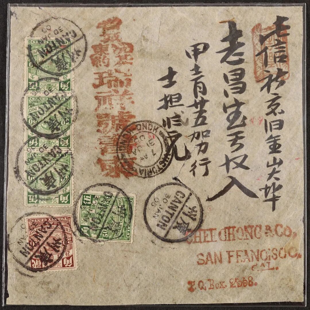 1905年广州寄美国旧金山桥批总包封面,瑞祥号书柬贴蟠龙5角四枚及3角一枚,计邮资2.30元,盖广州1月30日汉英半切小圆戳,另盖香港1月31日中转戳,贴票上佳销戳清,保存完好
