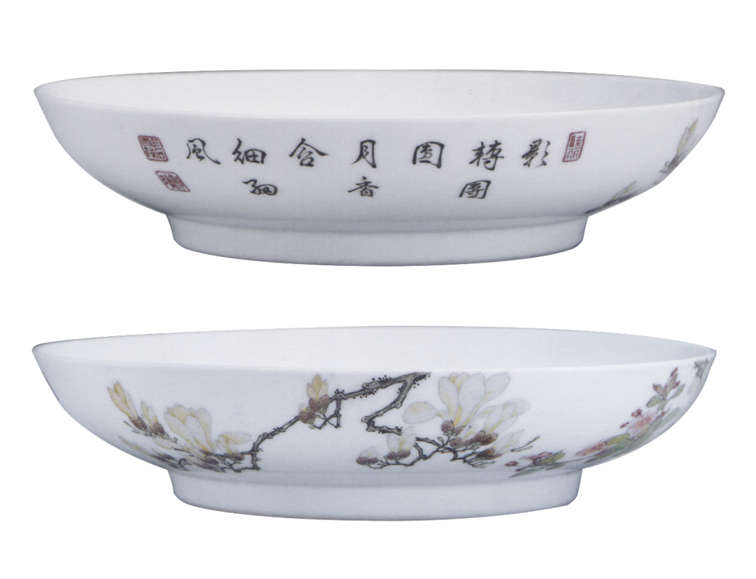 1.日本山中商会伦敦分公司支店长(任职1903-1922年)富田熊作(1872-1953)旧藏,去世后一直由其家人珍藏;乾隆皇帝在位时期,正值清王朝兴盛之顶峰,国富民强。其效仿古之先贤圣主,将精致完好的瓷器,看作德政的象征,希望借此赢得百姓的敬重。由是,其特别强调新样的创制,对御窑瓷器的烧制尤其投入。在提高官窑烧造预算的同时,严格审视督陶官的监造成效。珐琅彩瓷便是此中盛世孕育出的一颗璀璨明珠。珐琅彩,即磁胎画珐琅,与铜胎、玻璃胎、宜兴紫砂胎画珐琅等,同属清宫画珐琅。其最初由康熙皇帝推动,借鉴欧洲画珐琅,引进西方原料技术,经不断学习模仿、实验突破,于雍正乾隆时期达至制作巅峰。其烧造尤为不易,需先于江西景德镇御窑厂烧制瓷胎,运至清宫内务府造办处珐琅作,施彩后二次入窑方成。珐琅彩纹样丰富,远非一般成批生产之官用瓷器可以比拟,其绘工精妙绝伦,难出其右,数量极少,极为罕有。以端凝殿为例,其曾是清宫贮存磁胎画珐琅数量最大之处。道光十五年统计时,该处所藏乾隆磁胎画珐琅器仅约一百八十件,今多数珍藏于台北故宫博物院,故宫博物院、上海博物馆等亦有收藏;得以流通于市场者,凤毛麟角。此碗侈口弧腹,下承圈足,外壁以珐琅彩绘锦鸡一对,其一彩羽鲜亮明丽,五彩缤纷,属红腹锦鸡,又名天鸡;立于石上,各色牡丹盛放于旁,花开吐蕊,富力芬芳;玉兰花枝伸展至一侧,或含苞,或盛放,粉红海棠映衬于下,繁花翩跹,娇嫩明艳,皆春日花卉,满堂春色。玉兰、海棠与牡丹,谐音“玉堂富贵”,有显达富裕之美意。碗之另一面以墨彩书诗句“含影只应天际月”,前后分别落“先春”,及“金成”“旭映”胭脂红方章;底足内以蓝料彩书“乾隆年制”四字仿宋体楷书方章款。传世雍正乾隆珐琅彩碗见多种尺寸,造型多为侈口微外撇。如本器口部近乎无外撇之状,极为少见。相似例见台北故宫博物院藏清雍正珐琅彩瓷石榴黄鹂碗(故瓷17549)及清乾隆珐琅彩寿山福海碗(故瓷017361),尺寸形制皆与本器相仿,当为此类之制式。锦鸡以其华美之翎羽、优雅之姿态,深为古人所喜爱。故宫博物院藏宋代院体画《锦鸡芙蓉图》,绘锦鸡于枝头扬首凝望,芙蓉、秋菊盛开。此画有宋徽宗赵佶题诗,“秋劲拒霜盛,峨冠锦羽鸡。已知全五德,安逸胜凫鹥”。鸡向有“德禽”之称,《韩诗外传》中总结鸡有五德:“首戴冠者,文也;足搏距者,武也;敌在前敢斗者,勇也;得食相告,仁也;守夜不失时,信也”,可谓文武兼备、仁义勇敢、守信守节之佳例。甚至有学者认为,宋徽宗以此画中所绘之锦鸡自喻,其高贵至此。有清一代,二品文官的补服上,都绣着锦鸡的形象。乾隆十五年,宫廷画家余省、张为邦所绘之《鸟谱》中,锦鸡绘于第五册,引用古书中言其“甚有文彩”“焕耀如锦”“为王者冠服之饰”,知锦鸡于清人心中地位极高。珐琅彩所绘纹样需先由宫廷画师设计画稿,在旋好的模型上绘出纹样,经皇帝御览批准后,才由画师用珐琅彩料绘就。每一件都精心设计、悉心绘制,尽艺匠之所能,甚至常有宫中御用书画家参与制作。据清宫档案载,传教士画家郎世宁、清宫画画人唐岱等,都曾被指定画珐琅器的样稿,内阁中书戴临等曾被命为珐琅彩题写诗句。本器所绘锦鸡、海棠纹样,亦曾见于郎世宁笔端。现藏台北故宫博物院之郎世宁作《锦春图》,同样绘锦鸡一双立于石上,海棠花开似锦,锦鸡之位置与本器所绘相仿。戴临历任翰林院待诏、内阁中书、户部贵州司员外郎等职,曾参与编纂《御院本陶冶图册》等。其书法深得雍正帝青睐,清宫档案中见许多条目记载雍正命以其书迹做成屏风、书格等物装饰宫殿。观本器题诗之书法风格,与雍正珐琅彩极为相仿,同为戴临所书风格。本器虽署以乾隆款识,但其纹样风格与雍正时期珐琅彩极其相似。雍正珐琅彩碗即有画锦鸡牡丹纹样者,见台北故宫博物院藏清雍正珐琅彩瓷锦堂富贵图碗(故瓷17540),同饰锦鸡一对,伫立于石上,环以各色牡丹,绘制风格有相近之妙。另见台北故宫博物院藏清雍正珐琅彩瓷玉堂富贵图碗(故瓷017734)、清雍正珐琅彩瓷玉堂富贵图盘(故瓷8657),同样三种花卉,植株排布、枝干顿挫、花瓣釉彩渲染,皆极其相仿,且雍正例于诗文后同样绘“金成”“旭映”二章,墨彩诗句书风亦有相类之妙。“含影只应天际月”之第一字“含”,原为“合”,语出唐代诗人吴融《僧舍白牡丹二首》之“合影只应天际月,分香多是畹中兰”,形容牡丹的曼妙花姿。珐琅彩所书诗句虽多引自前朝诗句,但并非全然忠于古人,时有化裁之例,如本器将“合”改为“含”,又如台北故宫博物院藏清雍正珐琅彩瓷花竹图盘(故瓷17163),题诗选自唐代李咸用《庭竹》,自原诗二、三、四句各取“数竿风”“叶影”“映小花红”,重新写就“数竿风叶影,低映小花红”,得原诗之韵。本器经由富田熊作与寸巢庵递藏雅蓄。1900年,山中商会在伦敦开设分店,富田熊作于1903年加入,后成为伦敦分店店长,直至1922年回日本独立经营。正是在其努力下,山中商会伦敦店蓬勃发展,于1919年及1920年分获乔治五世、玛丽皇后颁发的英国皇室御用认证。富田熊作知识渊博,深为艺术鉴藏家所信赖,客户中不乏英国贵族及富豪。1924年,其与阿尔弗雷德·鲍尔相交。在此后的约三十年间,鲍尔购入了富田熊作推荐的每一件艺术品。今日在鲍尔基金会官网上,仍刊录有富田熊作的介绍及二