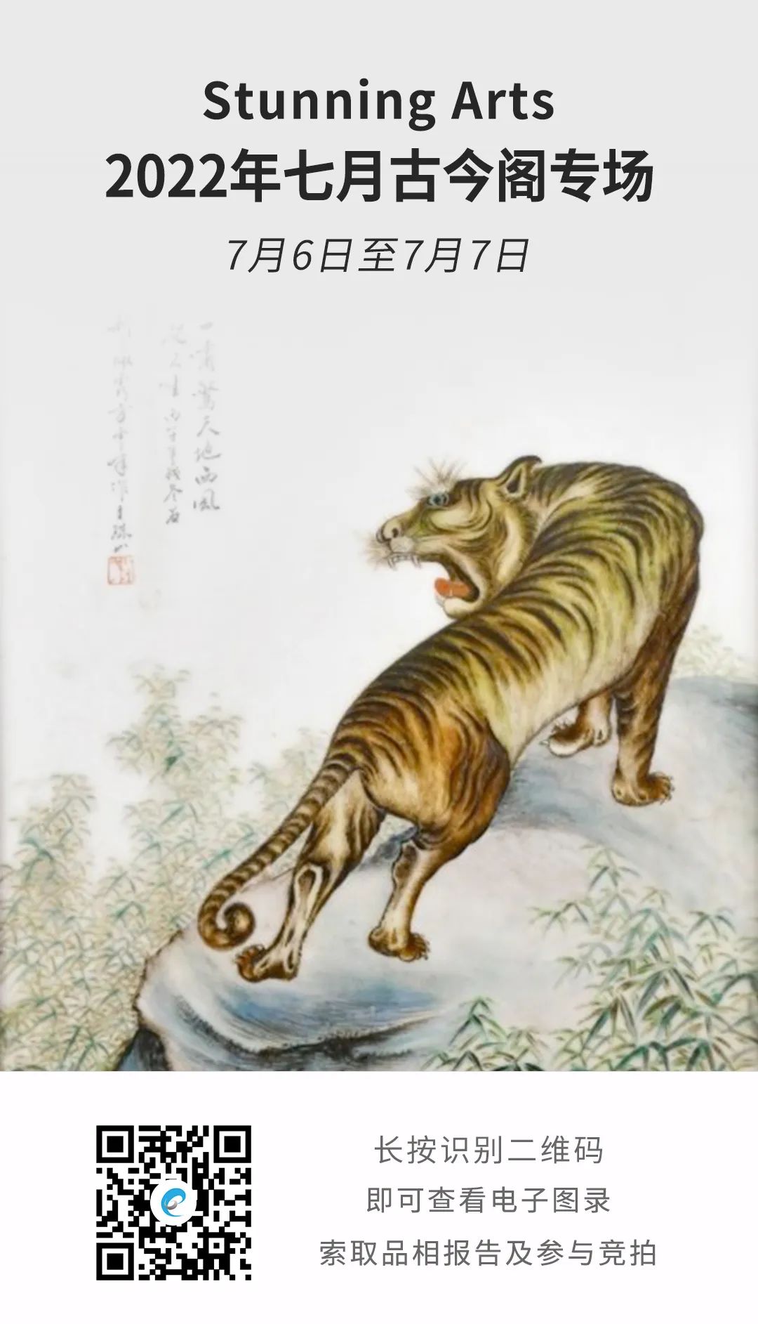 Stunning Arts Auction & Appraisal 是2015年在加拿大多伦多注册的中国艺术品拍卖行。其创始人为多伦多资深古董收藏家,凭着对中华传统文化的热忱及20余年来所积累的专业知识、鉴赏经验与人脉资源,经过数年发展,Stunning Arts 目前已成为加拿大首屈一指的中国艺术精品交流平台。在七月拍卖中,Stunning Arts 将呈现香港古今阁文物行的重要收藏,全部不设保留价,均以100元起拍。由于拍品众多,此场盛事将分两天进行,「瓷杂专场」和「玉器及书画专场」先后于北京时间7月6日和7月7日凌晨6点举槌。联拍在线将全程直播,并提供实时同步竞拍技术和服务支持。古今阁文物行原址为香港荷里活道209-223号的古今大厦,经由家族两代人的苦心经营,于1987年正式结业后,全家移民温哥华,自此所有藏品未再示人,因此都是非常难得的市场生货。strong>Lot 027 方云峰(1897-1957) 虎瓷板 连框尺寸:W 24.7cm x L 38.3cm;W 39.4cm x L 53cm(连框)尺寸:W 8.1cm x L 6cm x H 6.3cmLot 214 徐仲南(1872-1953)草虫菊花赏瓶尺寸:17cm x 16cm;19.8cm x 22.8cm(连座)