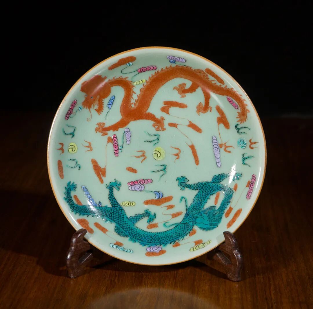 清嘉庆 豆青粉彩二龙戏珠纹盘