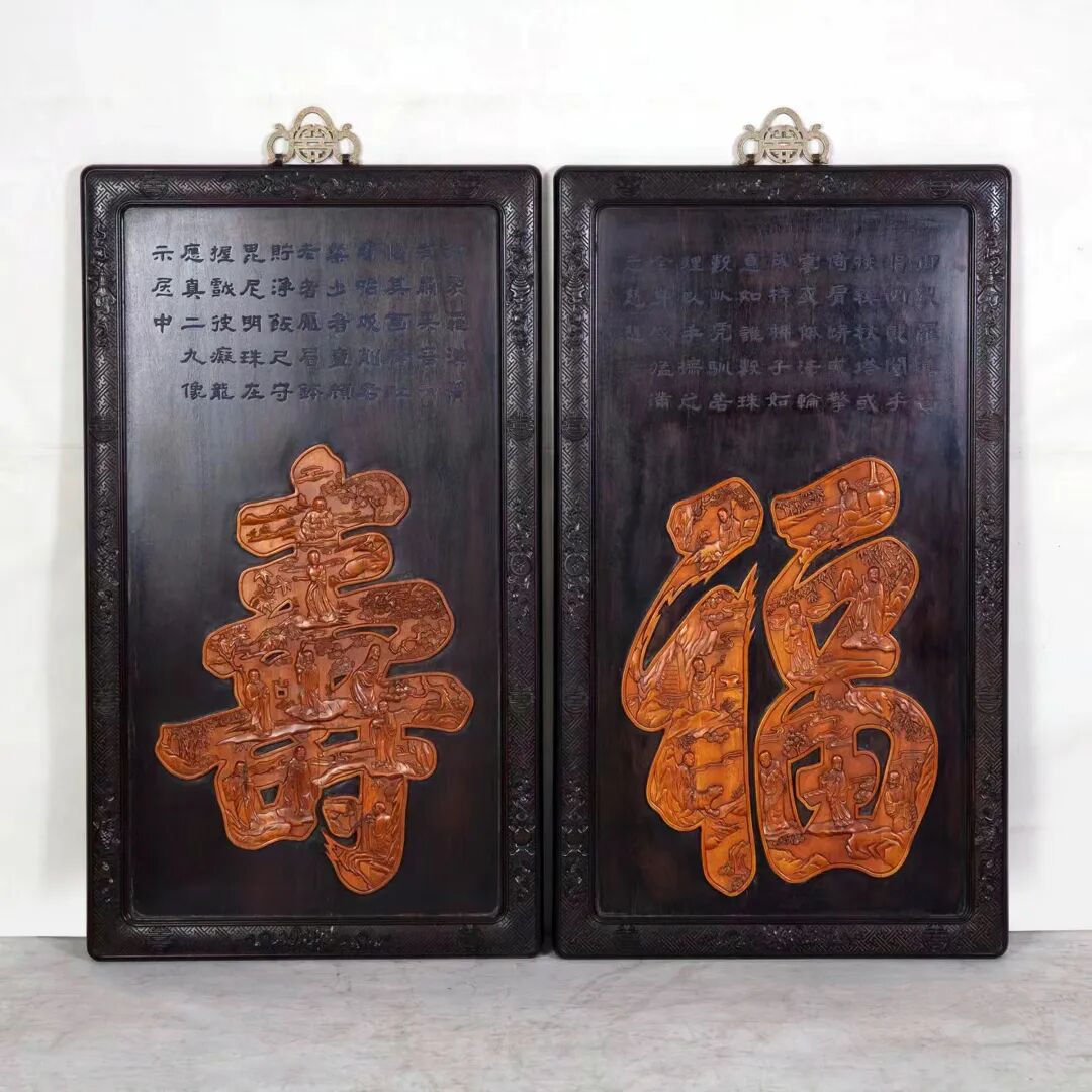 现代 紫檀嵌黄杨木雕十八罗汉“福寿”挂匾(一对)