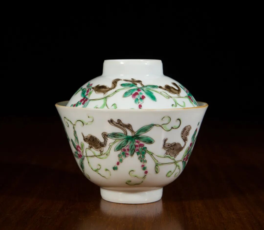 清道光 粉彩松鼠葡萄纹盖碗