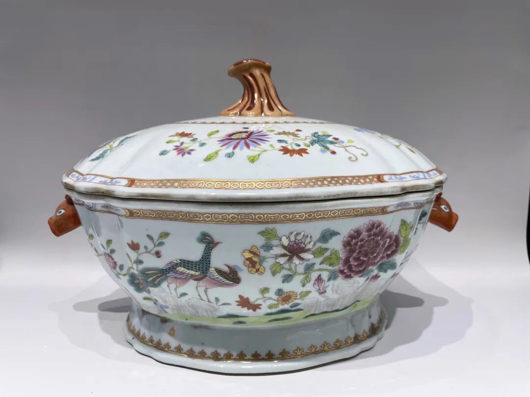 清 粉彩孔雀花卉纹兽耳盖盒