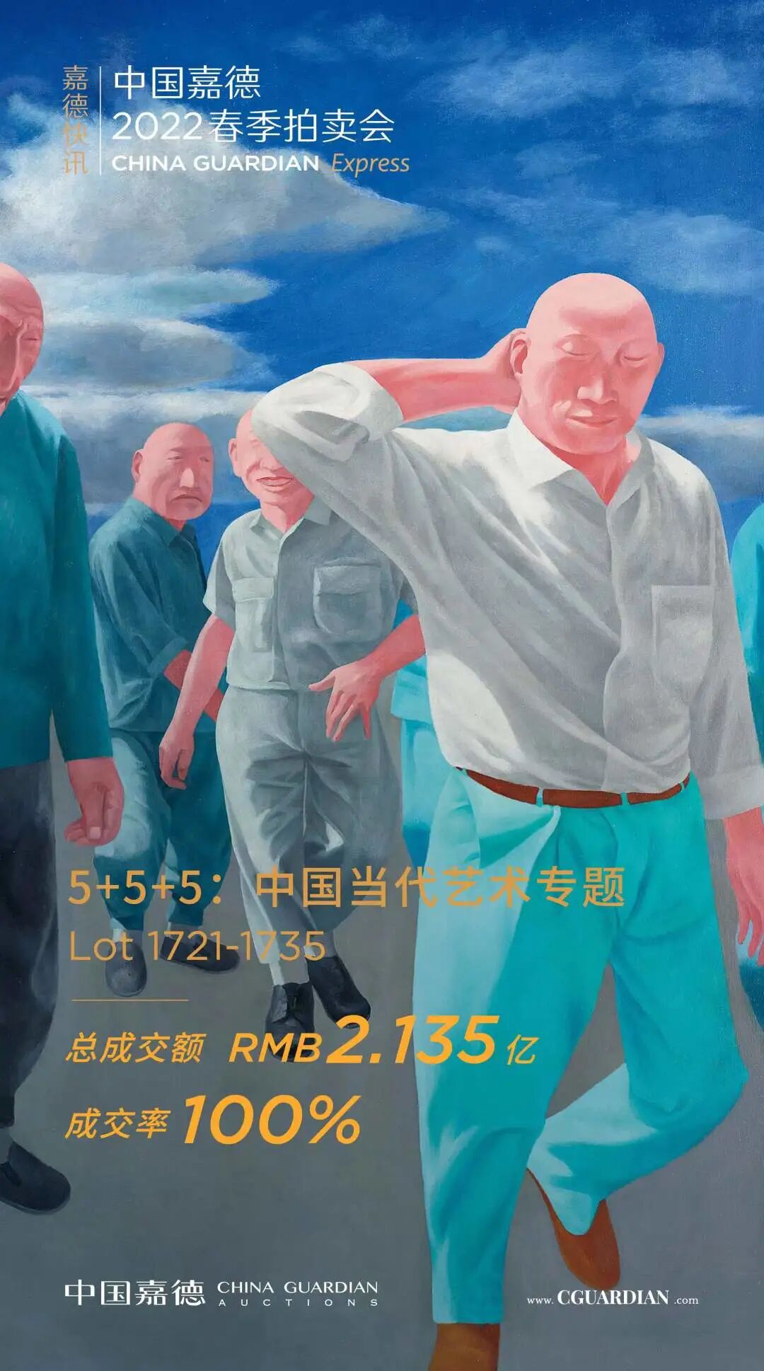 全场竞价气氛热络,藏家举牌积极踊跃,总成交4.05亿,两场夜场成交率分别高达88%和97.5%,其中8件作品成交过千万,11位艺术家创下价格纪录。精心策划的三大专题“5+5+5:中国当代艺术特别专题”和“余霞成绮|繁星丽天:20世纪现代艺术大师笔下的花花世界”,以及“20世纪人物风情志”,获得市场热烈回应,三个专题全部100%成交。2000年以来的中国新绘画专题竞价亦是激烈,成交率高达95%,集体表现强劲。