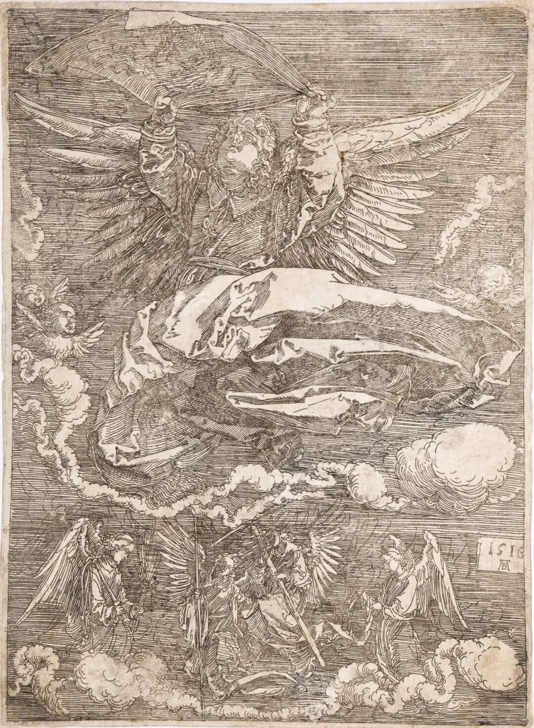提要:此版画创作于1516年,为约瑟夫·梅德编号丢勒第27号作品。此作描绘了一位手持基督面纱的天使盘旋于空中,基督面纱迎风飘扬。四位小天使于白云下端,旁边有丢勒徽章与“1516”字样。在丢勒一生创作的数百件铜版画中,铁质腐蚀铜版画仅创作了6幅,尤显珍贵。英国大英博物馆、美国大都会博物馆有藏。