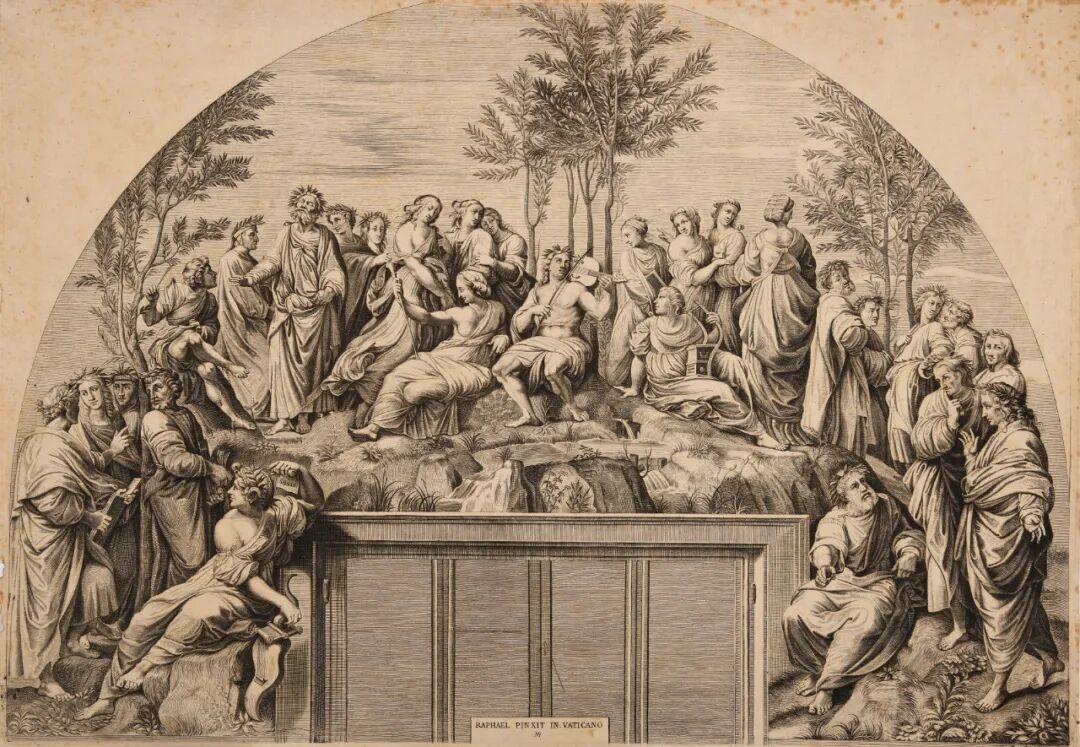 提要:此版画于1517年印刷,由意大利文艺复兴时期雕刻大师莱芒第根据作品大师拉斐尔于1515年左右绘制的一幅巨型湿壁画作品《诗坛》制成。壁画位于罗马梵蒂冈宫殿,其内容代表人类知识的四个领域“哲学、宗教、诗歌和法律”中的诗歌,描绘了阿波罗居住的神话般的帕纳苏斯山。他在中心演奏着乐器,周围环绕着九位缪思女神、九位古代诗人和九位当代诗人。画面下方有拉丁文“RAPHAEL PINXIT IN VATICANO(拉斐尔于梵蒂冈绘)”。