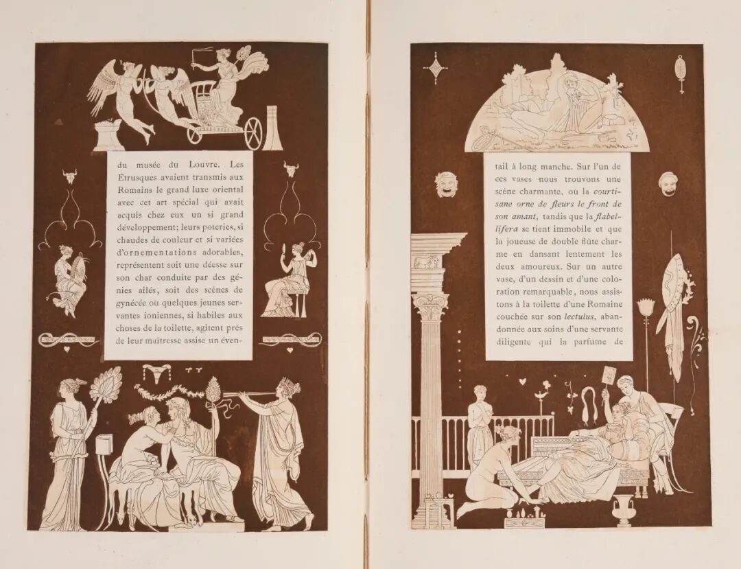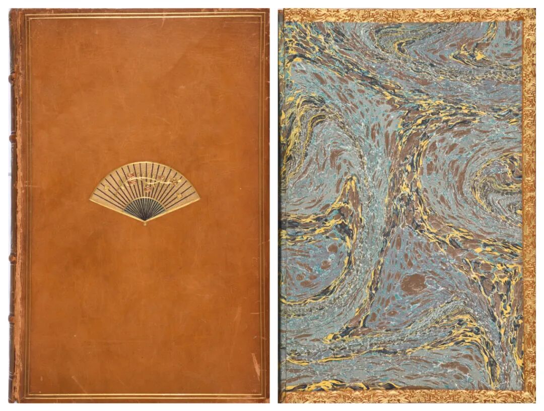 提要:是书1882年由巴黎A.Quantin出版,含有配合闺房故事装饰的大量套色版画插图。小牛皮手工装帧,采用特殊拼皮,工艺图案精美。