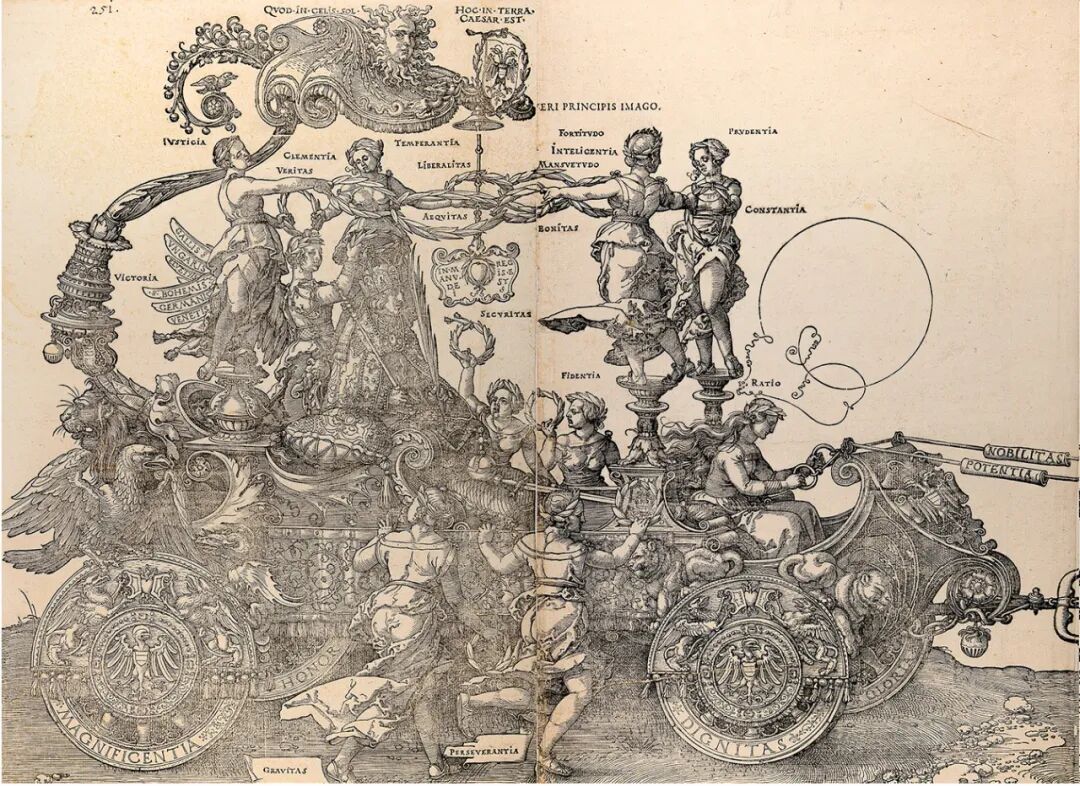 其他六幅车牌各绘一匹马,带着豪华的马具,拉着马车前行。印刷品的许多部分都贴有标签以解释复杂的图像:轮子上有“Magnificentia”(壮丽)、“Dignitas”(尊严)、“Gloria”(荣耀)和“Honor”(荣誉);一个re绳被标记为“贵族“(Nobilitas)(贵族),另一个被标记为“Potentia”(权力)。马车的驾驶员是“比率”(原因)。每匹马都由一个举着花环的女性人物照看:从后到前,“Providentia”(证明)和“Moderatio”(中度),“Alacritas”(敏捷)和“Opportunitas”(机会),“Velocitas”(速度)和“Firmitudo”(坚挺),“Acrimonia”(敏锐/敏锐/活力)和“Virilitas”(活力),“Audacia”(听觉)和“Magnanimitas”(magananiminty)和“Experientia”(体验)和“Solertia”(技能)。马车上还有四个女性形象:“Gravitas”(重力),“Perserverantia”(恒心),“Fidentia”(保真度)和“Securitas”(安全性)。上面的文字解释了这幅肖像画,前两对马匹伴随着一段文字,记录了1518年因斯布鲁克从马克西米利安到皮克海默的佣金。此作为原德国乌兹堡的马丁·冯·瓦格纳博物馆收藏,背面钤有其蓝色长方形收藏印章。英国大英博物馆、法国卢浮宫、美国大都会博物馆有藏。