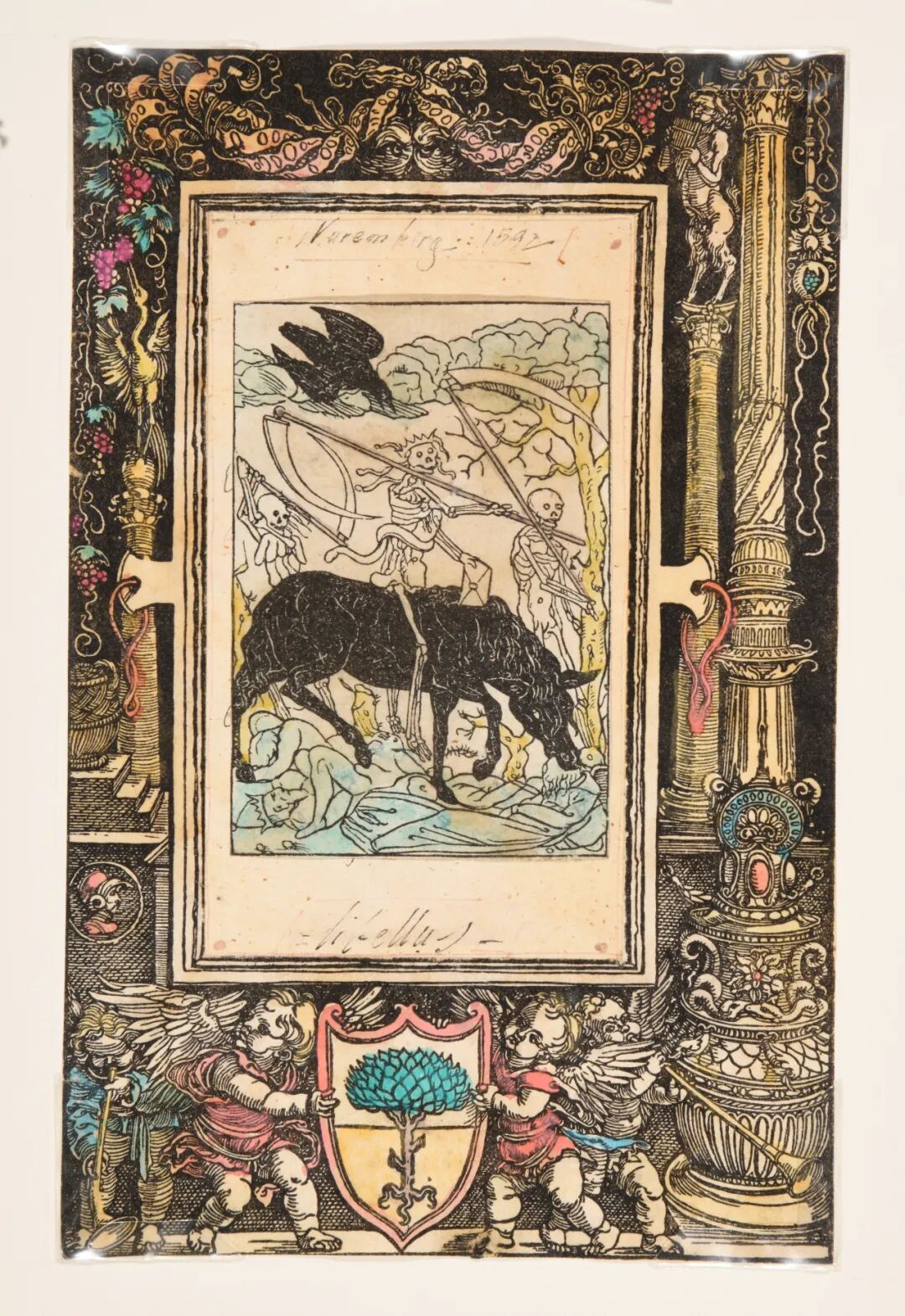 提要:此作为丢勒于1513年创作的版画的第二版,印刷于1596年,编号丢勒第281号作品。此作是他为威利博尔德·皮克海默设计的装饰性木版画,画中有持有盾牌的天使,、武器与瑞兽的纹饰。背面有收藏印章。