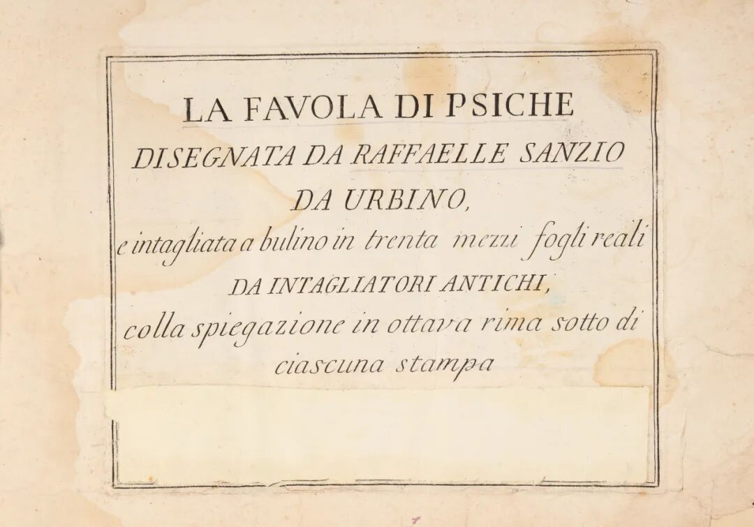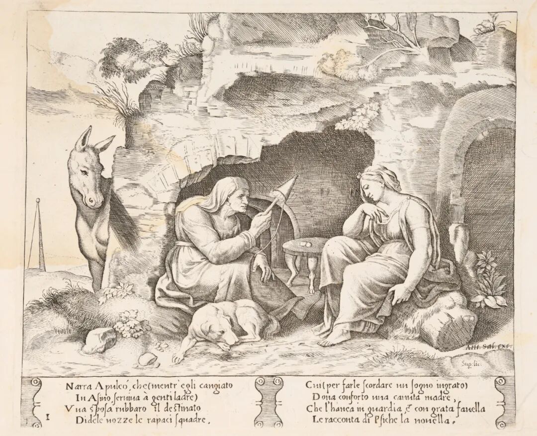 提要:是书1550年由罗马Antonio Salamanca出版。包含整页铜版画30幅,由意大利文艺复兴时期大师拉斐尔等绘制,描绘了爱神丘比特与普赛克的寓言故事。版画由意大利文艺复兴雕刻大师阿戈斯蒂诺·德·穆西、弗拉芒查理五世和西班牙国王菲利普二世的宫廷雕刻大师米歇尔·考西等雕刻。美国大都会博物馆有藏单页。