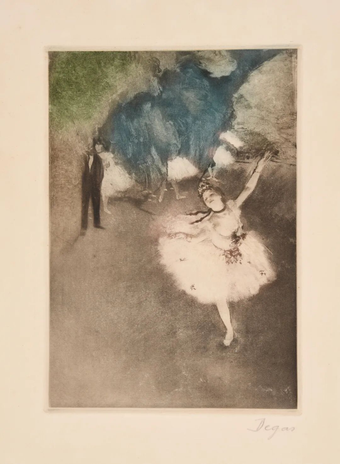 提要:此版画于19世纪出版,据法国印象派大师德加的名作《芭蕾舞女》制成。版画右下方有德加铅笔亲笔签名,并有有水印“BFK”,非常珍贵。
