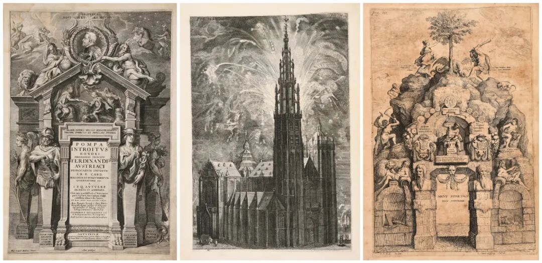 提要:此书1642年安特卫普出版,内含46幅(带编号的43幅)全页或折页雕刻铜版画,是200册豪华版本之一,也是荷兰巴洛克绘画大师鲁本斯一生中唯一一本版画插图集。其内容展现了天主教帝国军队在瑞典及其德国盟友的联合新教军队中取得了巨大的胜利。其中有奥地利红衣主教斐迪南在1634年诺丁根战役中获胜后,于1635年5月16日凯旋进入安特卫普市的场景,是该城市规模最大、最为壮观的节日。它被誉为普拉多博物馆“书目瑰宝”,是17世纪插图最华丽的书籍,也是所有节日书籍中最著名和最宏伟的。内有比利时档案馆藏书印章。该书大英博物馆有藏,题材难得,存世稀少。