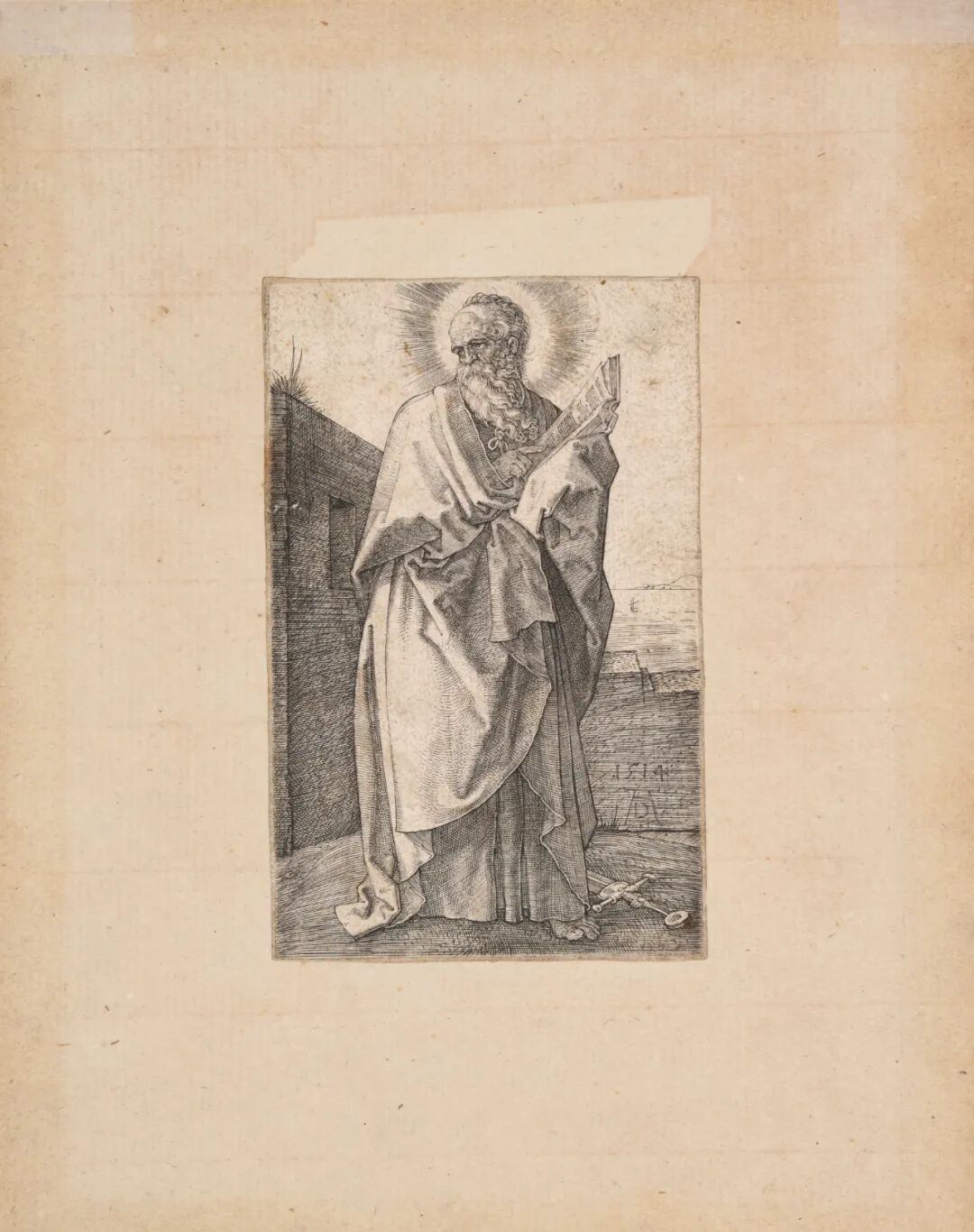 提要:此版画印刷于1523年,为约瑟夫·梅德编号丢勒第47号作品,为四幅圣人肖像雕刻铜版画之一。作品描绘了站立的使徒圣保罗,左手握着一本圣经,右手指着翻开的圣经。脚下斜卧着一把利剑,背景是矮围墙和海景。英国大英博物馆有藏。