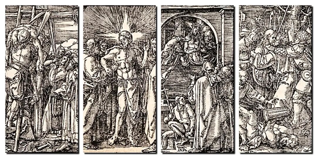 提要:此四幅版画出版于1612年,为约瑟夫·梅德编号丢勒第136(基督的背叛)、144(马丁内斯与希门尼斯)、151(下十字架)、158号(怀疑的圣·托马斯)作品。木版画《小受难》系列是丢勒最重要的版画作品之一,共37幅,于1509-1510年间创作。1511年正式以拉丁文结集出版,后来又印刷了约5版。此系列木版画原版大部分现收藏于大英博物馆。