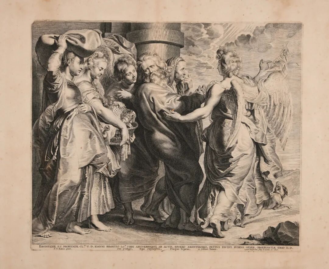 提要:此版画1620年于安特卫普出版,据巴洛克绘画大师鲁本斯1613年左右创作的《罗德及家人逃亡》,由绘画大师范戴克绘稿,巴洛克雕刻大师老卢卡斯·奥尔斯特曼雕刻。画面下部有拉丁铭文,意为“鲁本斯画,享有最信奉基督教的国王、比利时王子和荷兰骑士团的特权,卢卡斯雕刻”。英国大英博物馆有藏。