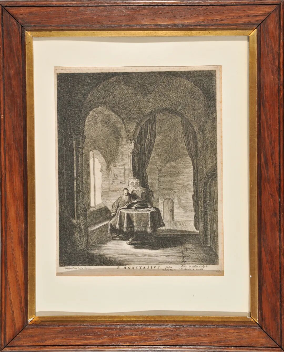 提要:此版画于1650年出版,据荷兰黄金时代巴洛克绘画大师伦勃朗1631年创作的《安纳斯塔修斯》制成。画面描绘了一位老学者波斯的基督圣人安纳斯塔修斯在拱形房间里看书,微弱的阳光从右边大窗户和左边的门口落下。铜版画纸张有“荷兰皇家盾牌、手套”等图案水印,背板有字母“VI”水印。此铜版画英国大英博物馆有藏。