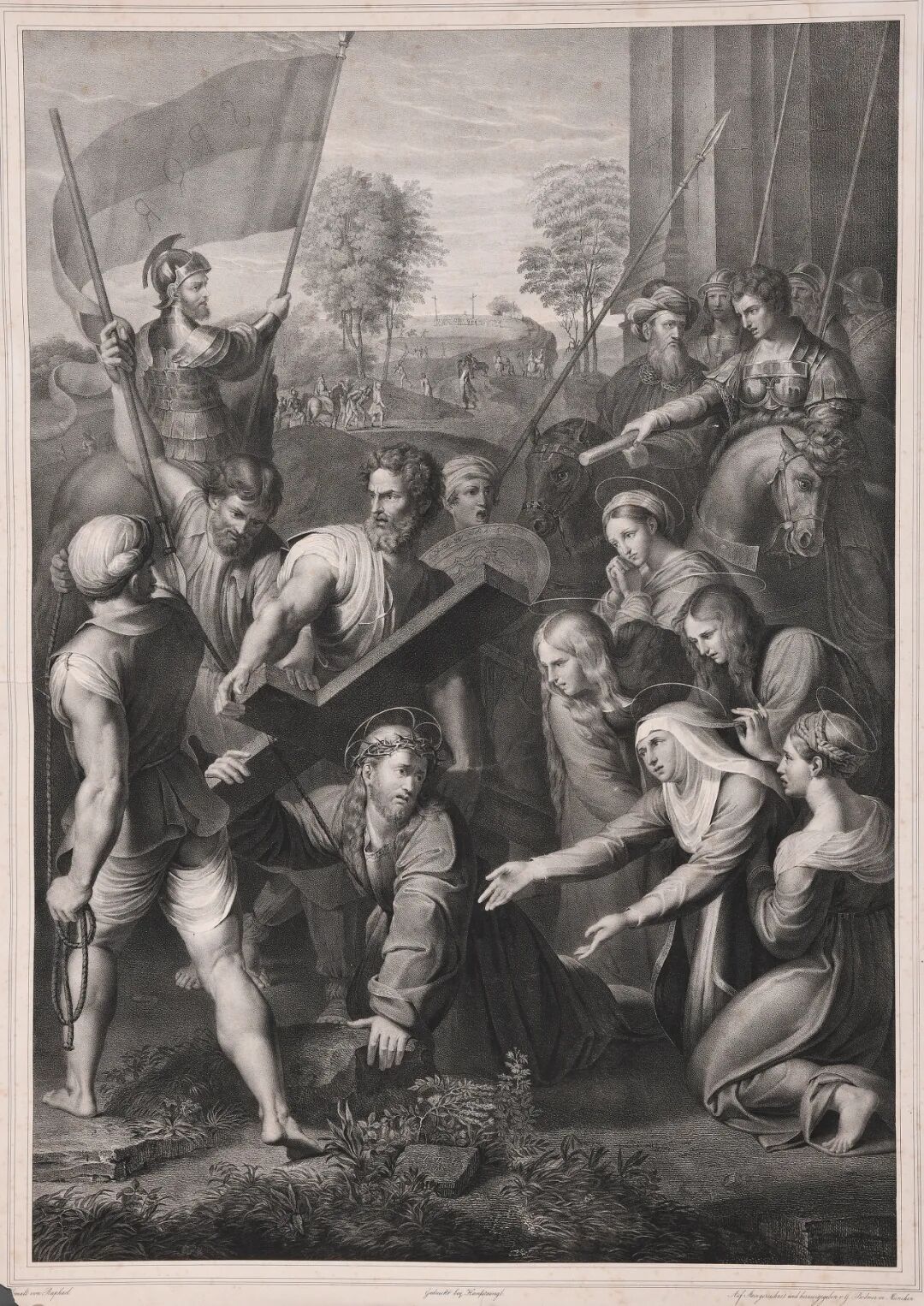 提要:此版画19世纪慕尼黑出版,根据意大利文艺复兴大师拉斐尔于1515年创作的油画《基督赴刑》雕刻。画面描绘了基督在受刑途中跌倒的场景,圣母玛利亚痛不欲生,昏厥在地。远处,各各他的小山隐约可见。