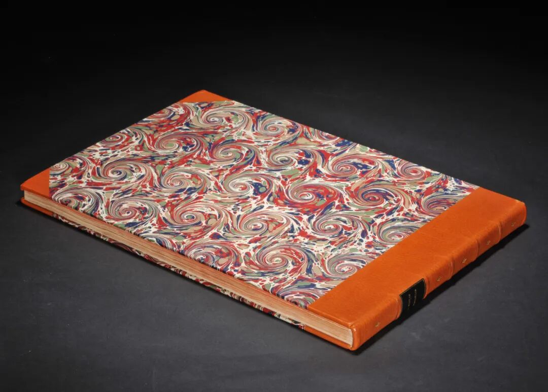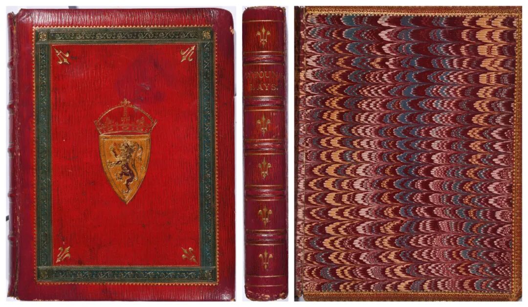 提要:装帧师Ramage设计制作,深红色真皮烫金贵族纹章图案并装饰拼皮彩色环纹,书内有丰富精美插图。