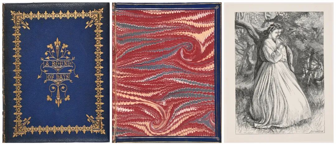 提要:是书1866年由伦敦George Routledge and Sons出版,内含多位英国名家绘制的黑白线雕版画,并伴随威廉·艾灵顿、玛丽·霍韦特、汤姆·胡德等诗人的诗歌作品。达斯勒兄弟工坊主要作品收藏于大英博物馆。是书蓝色摩洛哥皮烫金轧花装帧,装饰有鸢尾花等精美图案。