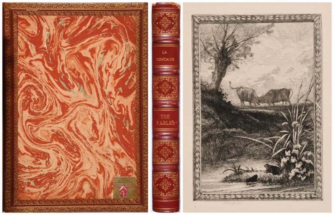 拉封丹寓言版画集 1884年伦敦J.C.Nimmo and Bain出版提要:是书1884年由伦敦J.C.Nimmo and Bain出版,由装帧师Frederico D’Almeida手工设计,内含稀有的25幅整版蚀刻版画插图。红色烫金摩洛哥皮封面,葡萄牙装帧风格。书内贴有葡萄牙里斯本著名珍本书店标签。