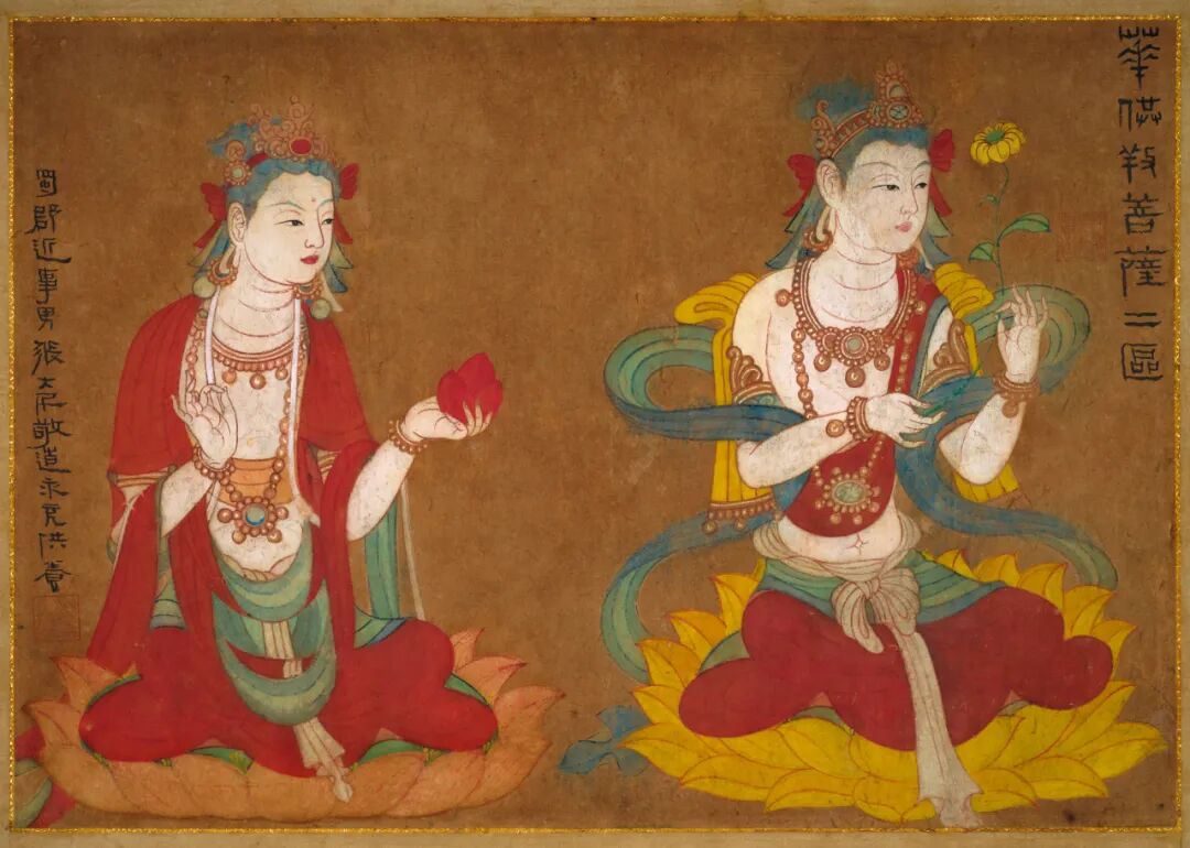 张大千掀开了敦煌壁画的神秘面纱,也正是从敦煌开始,张大千人物画一改明、清诸家纤弱柔丽的小家碧玉之风,而直追唐人高古、雄奇、瑰丽的境界,此后,张大千笔下人物精品多体态自信从容,形容健硕丰美,予人风华绝代又雍容华贵之感。拍品估价:6,000,000 - 8,000,000 人民币题识:花供养菩萨二区。蜀郡近事男张大千敬造,永充供养。*如欲竞投本件拍品,敬请提前联系,办理特殊号牌方可竞买。张大千最优秀的人物画作品然往往“脱俗恬淡,有飘飘然之态”,这一特质与敦煌菩萨有着莫大的关系,尤其是敦煌壁画中形象自由姿态丰富的供养菩萨。这二区供养菩萨正向偏右跌坐于一粉一黄双色莲花上,不同于临摹时期为追求效率往往张大千只勾线由门生弟子及喇嘛涂色,此件从勾线到设色均为张大千手笔,整体风格看,应晚于1940年代。此二区菩萨以游丝描勾线,设色妍丽,身形丰美,虽为坐姿,但体态轻盈而神情祥和,有宝相庄严之态,是典型的唐代菩萨。二区菩萨均着络腋、披帛、腰裙、长裙,配饰则有宝冠、璎珞、项圈、臂钏、腕钏等,是敦煌壁画中典型的菩萨着装配搭,画家却在精微处表现此二尊菩萨的区别,比如都是正向偏右,神情内蕴风姿却各有千秋。粉色莲花上的菩萨更觉柔美,披帛较宽,覆及双肩及双臂,材质丝滑的垂感有“曹衣出水”之妙,颇似贵妇霞帔,而黄色莲花上的菩萨则颇刚健,披帛较窄,从背后经双臂缠绕,大有“吴带当风”之姿,从质地看当是纱质,其上身大半裸露,优雅健美身形呼之欲出。
