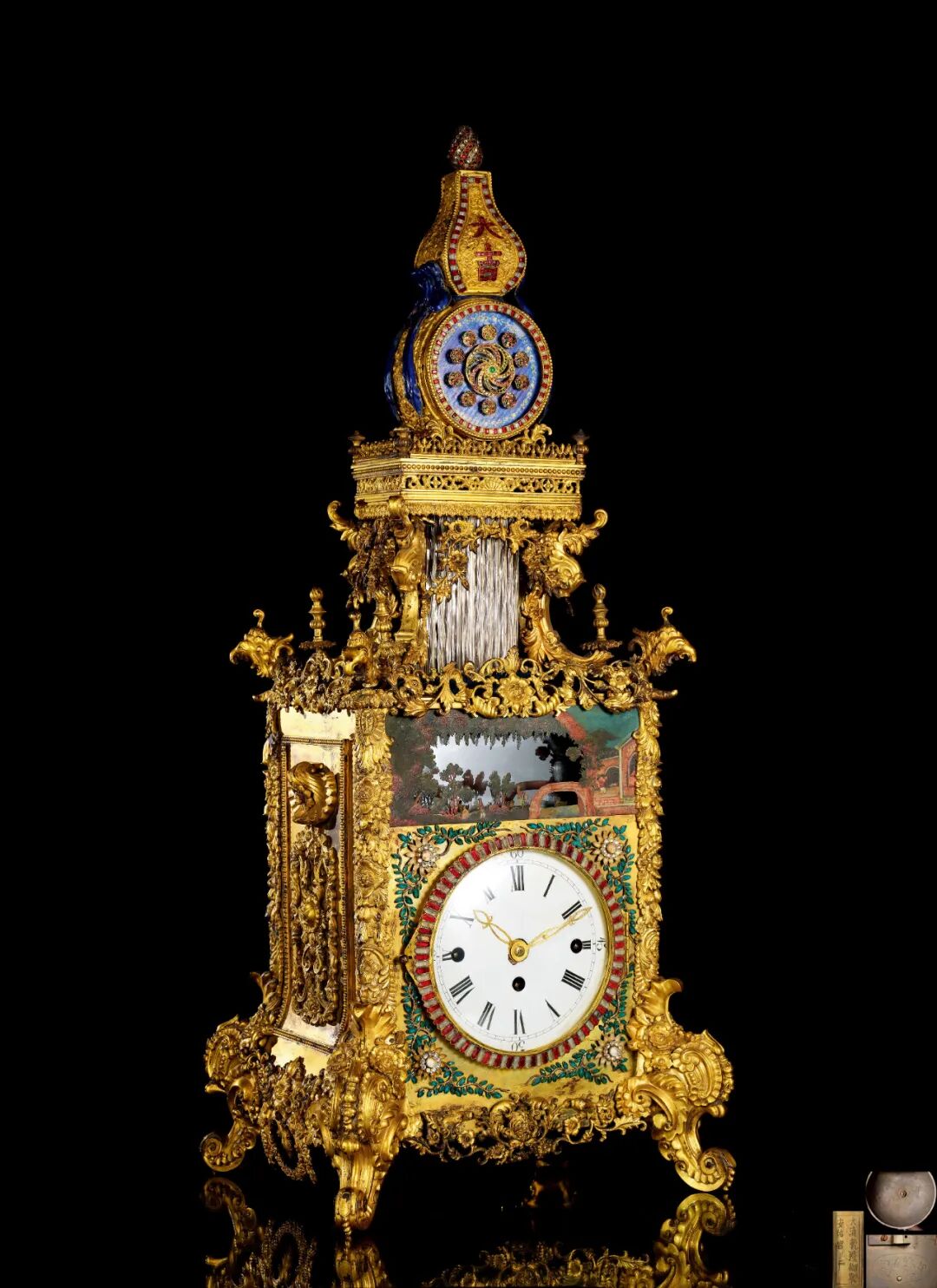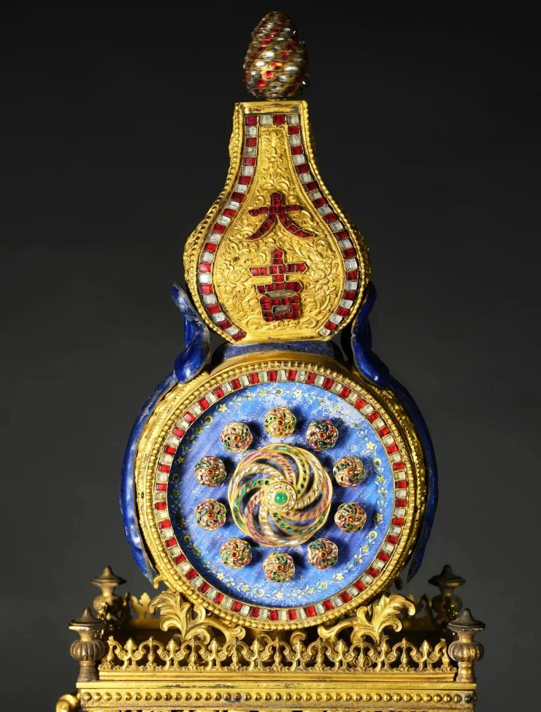 此钟精致工巧,备极崇丽,宝光瑞色,矞矞皇皇。远瞻其形,俨如崇台杰阁,令观者仰首堕帽。俯察内堂,仿佛曲房洞户,让入者迷不得出。造构三层,摹拟金阙之势,骈罗百宝,备集瑶台之美。上为铜鎏金珐琅嵌料石大吉葫芦,内设机关,自成一体。顶饰料石菠萝花,腰缠蓝珐琅绶带。上腹珠玑琉璃拼作“大吉”二字,下腹开光蓝地画珐琅转盘,凤尾转花,如宿拱斗,小者环列,大者居央。赤瑕密缀,珠翠满镶。其下为开光西洋田园人物布景。下为钟箱,贝耳如扇,四足翻卷,门户在后,晷盘居前。深藏机奥,轮行而刻转,盛饰金石,精雕而细篆。金葩纠缦,莨苕繁演,葳蕤扶疎,勃然伸展。底耸高垂,上呼而下应,布局谨严,纷错而不乱。表盘之面,玉叶琼枝缭绕四角,随珠火齐增华周沿。指针镂空,教堂塔尖之样式,辰界分度,南匠巧手所勾填。与此相类的座钟见于北京保利2011年春拍编号7232,拍品来源自美国帕特丽夏·克鲁吉(Patricia Kluge)旧藏,曾经陈设在亚伯马尔豪邸(Albemarle House),成交价为78,200,000元。本品与帕特丽夏所藏在形制上不分伯仲,仔细对比,可见在细节上互有长短,难分高下,同属稀世之珍。