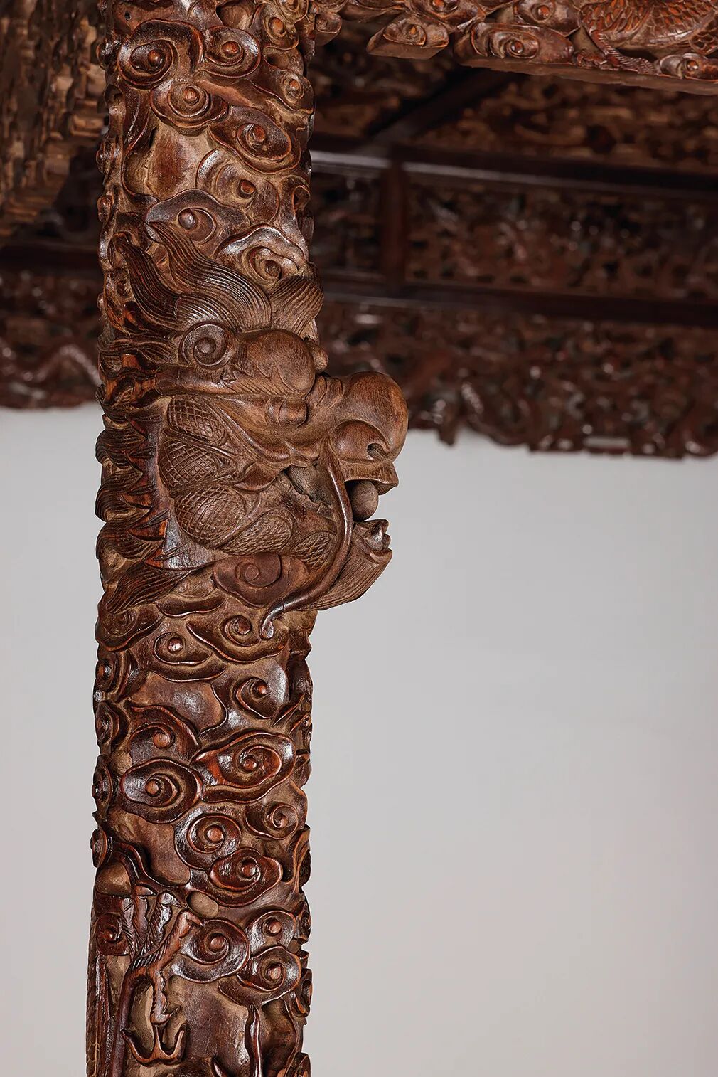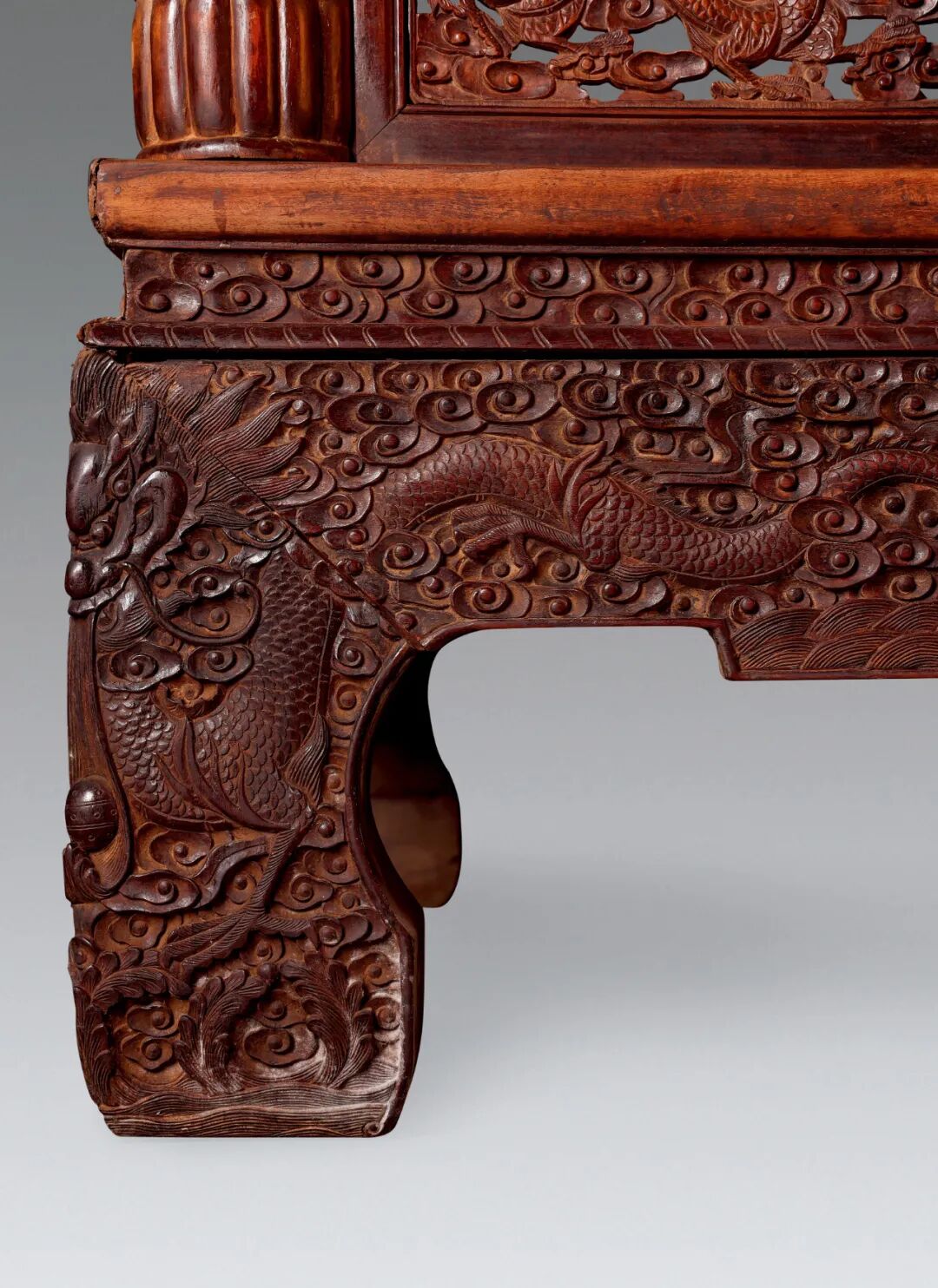 拍品估价:1,000,000 - 2,000,000 人民币本品形制巨大,出自天津旧租界大宅,全身内外用上等红木雕工繁复精细,观者无不赞叹称奇。龙床四柱及围板祥云纠缦,神龙出没其间。神龙形态凶猛,细节丰富,双目炯炯有神,龙麟片片,起伏转折,交代清晰。寝卧其中,茫洋穷乎玄间,如乘云驾龙,傲游天宫,遍历奇境。试数龙数,共得九十五条,适何九五至尊之意,可知本品的是为人主制作,供给帝王所寝居。从雕工上看,本品的龙云纹属于晚清民国典型样式。虽然说祥云和神龙是明清两代宫廷器物中最常见的纹饰,但架子床并不是清宫常见使用的家具。但清末民国见,胆敢公然雕刻九十五条龙,比拟天家,绝非一般人可以为之。