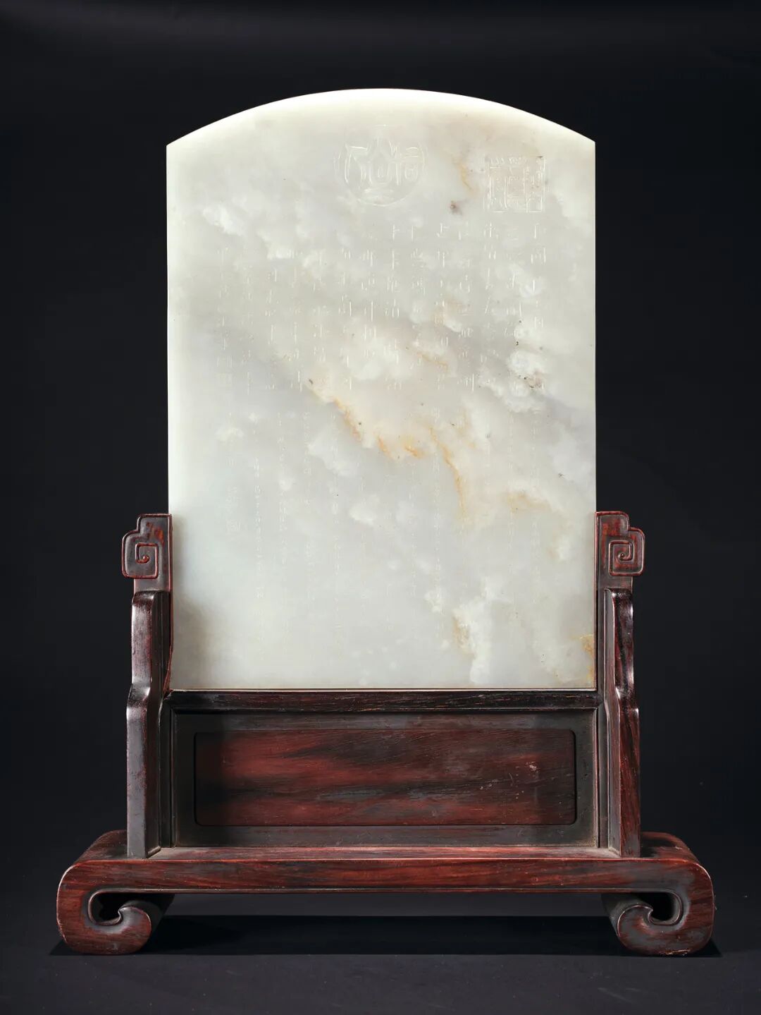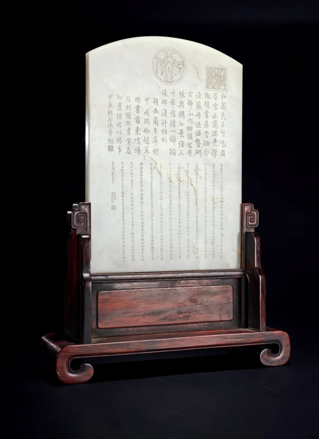 拍品估价:1,800,000 - 2,500,000 人民币此件御题幽兰白玉插屏,用料上乘,不惜工本,质地洁白,雕镂精美,兰草曲线优美,奇石巉岩有致,正面及反面满布文字,工艺精细入微,令人叹为观止。玉屏上方刻有御宝三方,一面兰石图上的是“古稀天子”,另一面上刻的是“八征耄念之宝”、“信天主人”。“古稀天子”一面刻有乾隆御临《赵孟頫书苏东坡诗》一首,其下浮雕兰花奇石图,与御题诗互相呼应,左下方还摹刻有印章一枚,为“几席有余香”。玉屏另一面的下方镌刻了《御临张照书黄庭外景经》,上方镌刻了《御题幽兰玉屏刻甲戌所仿赵孟頫书苏东坡诗并刻张照书黄庭外景经诗以志事》,该诗见载《钦定四库全书》内的《御制诗五集》卷一。此诗讲述乾隆甲辰,即1784年,乾隆皇帝将旧存甲戌,即三十年前1754年所临的赵孟頫、张照之帖,命造办处钩摹刻于一方幽兰图玉屏之上。从试题可以得知,此首御题诗也一并刻在了幽兰玉屏之上。翻阅《清宫内务府造办处档案》第四七册,本品可以找到对应档案记录,但档案内所提到的是青玉底座,如今所见到的却是木座。按照档案最后小字的补注,可知玉屏和木样发往苏州织造制作完成后,青玉插屏架的成品不能令人满意,如今所见的木插屏架,应是当年的木样,十分难得保存基本完好。