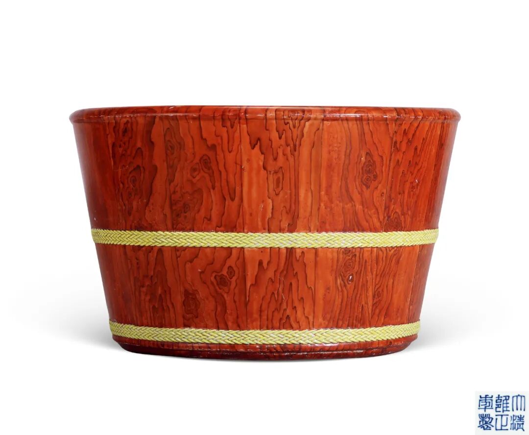 清雍正 洋彩仿花梨木纹釉黄彩篾纹瓷桶