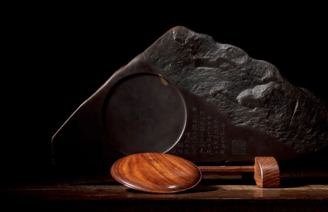拍品估价:1,200,000 - 1,500,000 人民币铭文:粤溪茶坑砚,石皮色斑驳,研工每去其色,使中规矩,此石留其色以为研山,再开一池以试墨,俾知为佳研材也。