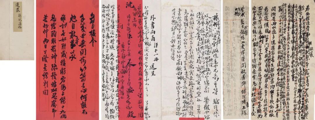 起首开门见山以病请辞,随后作述职总结,力陈不善,并隐诲点出离职的真实缘由一一拒释藩库:“藩司总财政之枢,金布令严,饷敕需责重统一,既无成效”,可谓举重若轻。余下三分之二篇幅,再细数残躯病体、私情家事等等,其中化用李密名篇《陈情表》作句:“乙单门寒族,无期功强近之亲”,大大增强了文辞的感染力。全篇虽曰请辞,字里行间仍流露出对皖垣之不舍,可谓情真意切,读之令人潸然。此稿共分三纸,书于自用的“禊帖界格”水印笺纸之上者,为“辞皖”内容的最重要部分,其书法出入山谷与海岳之间,波磔灵动,骨力畅达,以短锋兼毫入纸,大字多湿笔浓墨,点划丰肥,又多作涂抹修改,蝇头小字充盈其间,形成了粗细、大小、疏密等错落有致的视觉效果,颇有沉着痛快的意气。另一通书于沈曾植平日信件往来废弃的信封之上者,亦为辞皖相关的书稿,可圈点之处当属精妙入神的小字行书,其点划细劲、精神团结,结字含章草风貌,提按、转折又矫健硬朗,若笔力聚之毫端,发之一瞬,字虽小而通篇尤有一泻千里的气势。最后一通为书于红笺纸上者,亦为信稿,有别于前二者的书风,更近于米,为沈曾植六十岁后的一种典型风格。张晏《跋祭侄文稿》云:“告不如书简,书简不如起草。盖以告是官作,虽端楷终为绳约;书简出于一时之意兴,则颇能放纵矣;而起草又出于无心,是其心手两忘,真妙见于此也。”无论从史料或书法角度观之,此三稿都极为可贵。