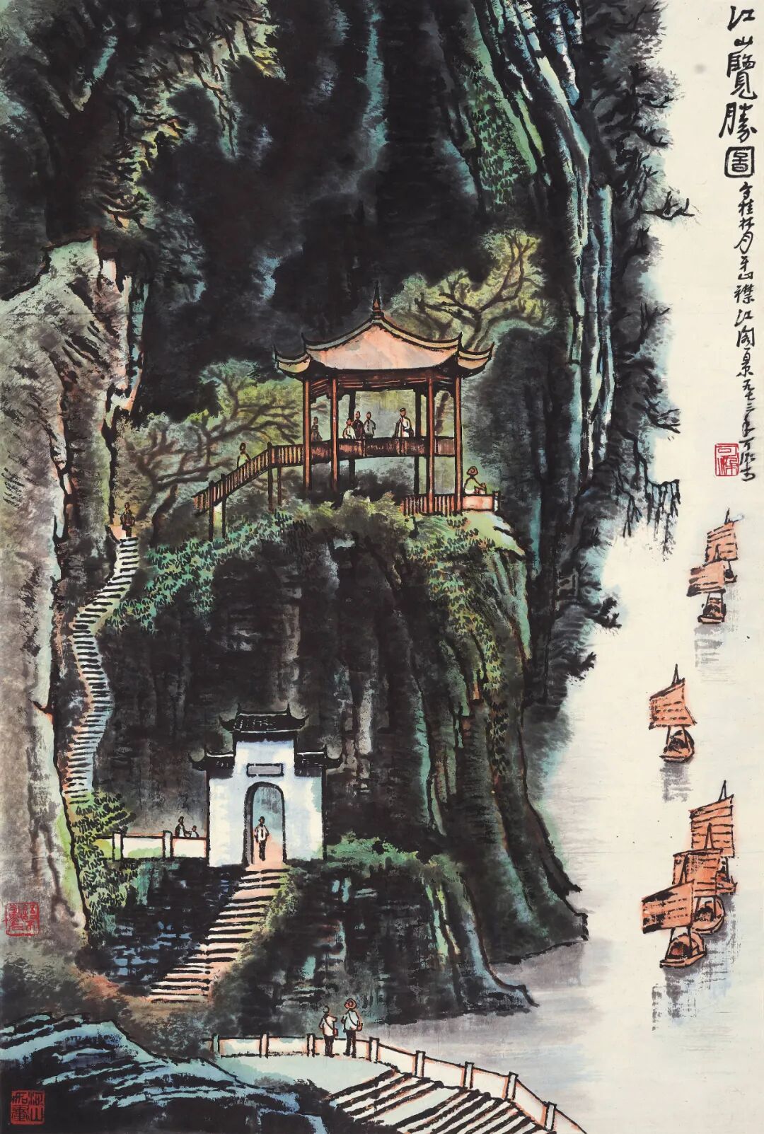 拍品估价:9,000,000 - 11,000,000 人民币题识:江山览胜图。写桂林月牙山襟江阁一景。一九七三年,可染。1. 《侨岷华园藏画》第 288-289 页,(台北)鸿禧艺术文教基金会,1994 年。2.《嘉德二十年精品录1993-2013·近当代书画卷(四)》第1620 页,故宫出版社,2014 年。3.《江苏历代人物传记丛书·李可染》第 175 页,江苏人民出版社,2016 年。说明:此作品为1990 年11 月荣宝斋(香港)拍卖会第40 号拍品。
