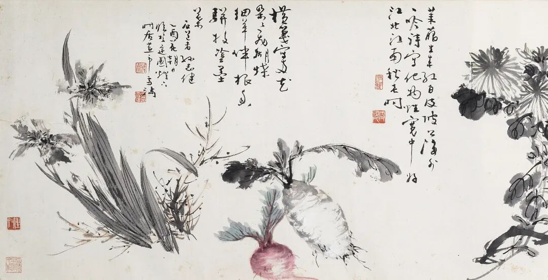 8.莱菔生来红白皮,坡公海外一吟诗。写他物性宽中好,江北江南秋春时。